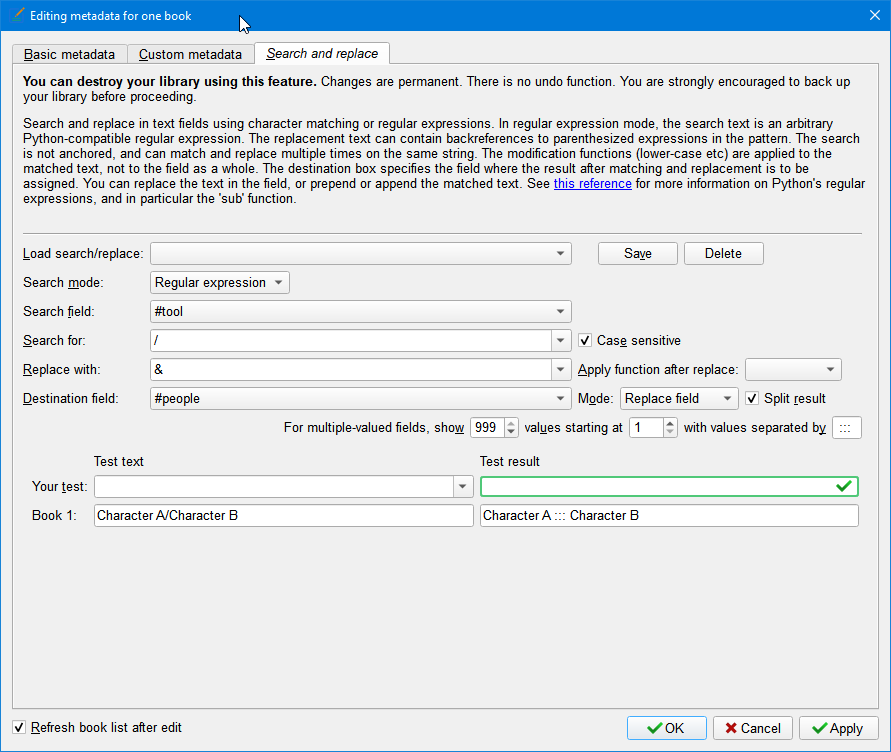 ![]() ![]() For those who are interested in doing something similar, here's the details: For the Pairing to Characters conversion, I set up an Action Chain exactly as chaley said, so I could run it on the books currently in my library. (New books imported will automatically populate #characters based on that field in FanFicFare.) The #characters column is a Comma Separated Text, like tags, shown in Tag Browser, with the "Names" option checked. For my #koboshelves column, I set up a custom column as a "Column built from other columns, behaves like tags" with the following template: Code:
