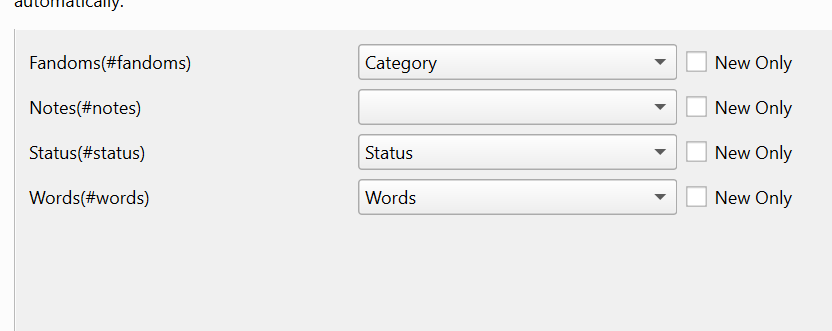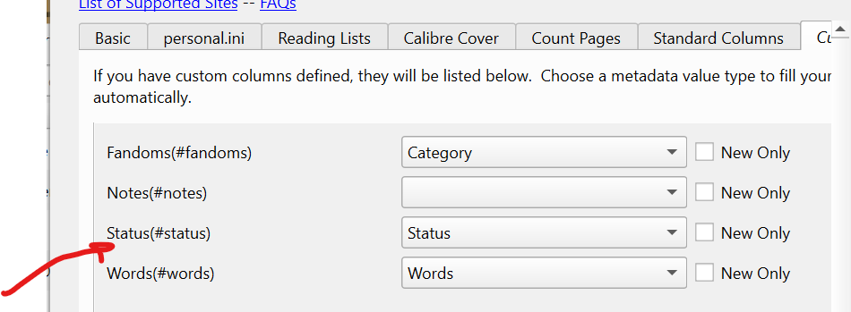 First of all I would set up a test library so you won't corrupt files trying to get things right. Second set up at a colunn to save metadata. Set it up as long text, like culumns and then under customize fanficfare, at the bottom of the Customs Columns tab set "Saved MetaData Column" to the column you just created. This allows you to rapidly update from the saved metadata column as you figure things out through trial and error without hitting the site over and over again. How do you know which tyoe of column to set, that all depends on what you want to do. Start by browsing this forum for exmaples, there are many. To give you a starting point, for wordcount and pages? I set mine as integers. For status and different fandoms for example I use Comma seperated, like tags. And for notes I would set as long text like comment. And anything date of time related, use dates of course. For a read status I'd use a Yes/No type of column. As for your personal.ini file, start with reading the comments under the defaults Jimm has set up. There are many tips on basic settings and in addition read https://github.com/JimmXinu/FanFicFa...dataManagement This and browsing this forum will get you started. |