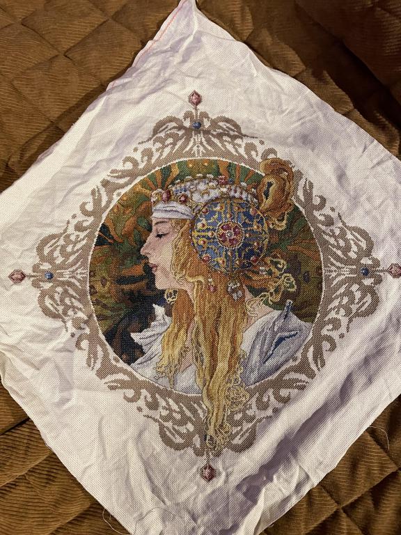 I've decided to hold off on starting my next project. I'll first need to grid the fabric and I just don't have the time or energy to do that before I'm going on vacation. I still have the small project I'm working on, so I'll finish that first, bring it with me on vacation. I still need to wash the Mucha, then I can hand if off to my sister who will iron it and take it to be professionally framed. I already have the kit for The Brunette, but it'll be a while before I get to that one, I first want to do a bunch of simpler patterns and kits. Last edited by issybird; 09-20-2023 at 08:40 AM. Reason: Oversize image attached as thumbnail. Please read the guidelines for limits on image size. |