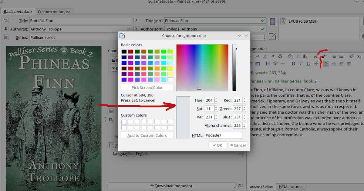 The background/foreground screen colour picker on the metadata page isn't working like it used to. When I select either, the entire screen goes blurry, opaque like. The picture or book cover on the left is all opaque and no matter what colour I choose with the colour picker they are darker than what's actually in the pic. Eg. If I select pink, it shows in the picker as a maroon; white shows a deep gray, green shows a muddy something etc. I tried different screen settings but the same result. |
