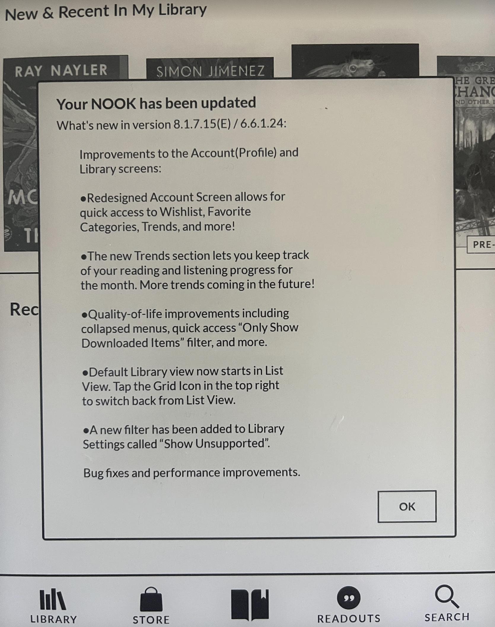 The account screen has the new Trends capability! I liked how the iOS app received this and wanted it on actual eReaders. Shows how many days in the month you read or listened to audio. It's a small thing that some people care about. Some additional filtering options are also present. Haven't really tinkered too much to see if "performance improvements" are felt or not. Note: goodereader.com does not have my consent to use the included image or any of my text for their website. |