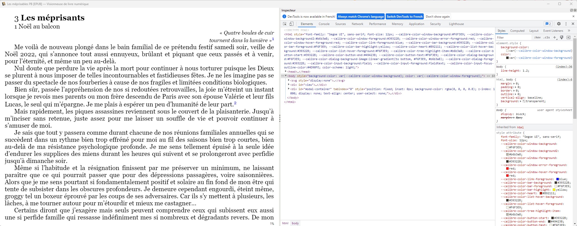 Here are some screenshots to give you an idea of my problems. 1) what I see in the .odt or .docx file to create the ePub (of course different from the paper version of the book) with some details in colors in red, green and blue : 2) How it appears in the ePub on the left with the code on the right : 3) detail of the left part of the 2nd photo always with color details of what I want: 4) detail of the right part of the code in the 2nd photo : Can you help me with these photos? Thanks. Thierry Last edited by issybird; 10-07-2023 at 08:27 PM. Reason: Colossal images thumbnailed. Please read the guidelines for limits on image size before posting again. |