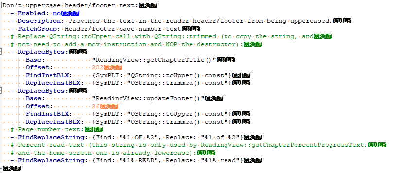 That way I don't have to change all the patches I want to yes and I can include some custom patches and the better hyphenation dictionary. I've attached my kobopatch.yaml file so you can see what I've done. |