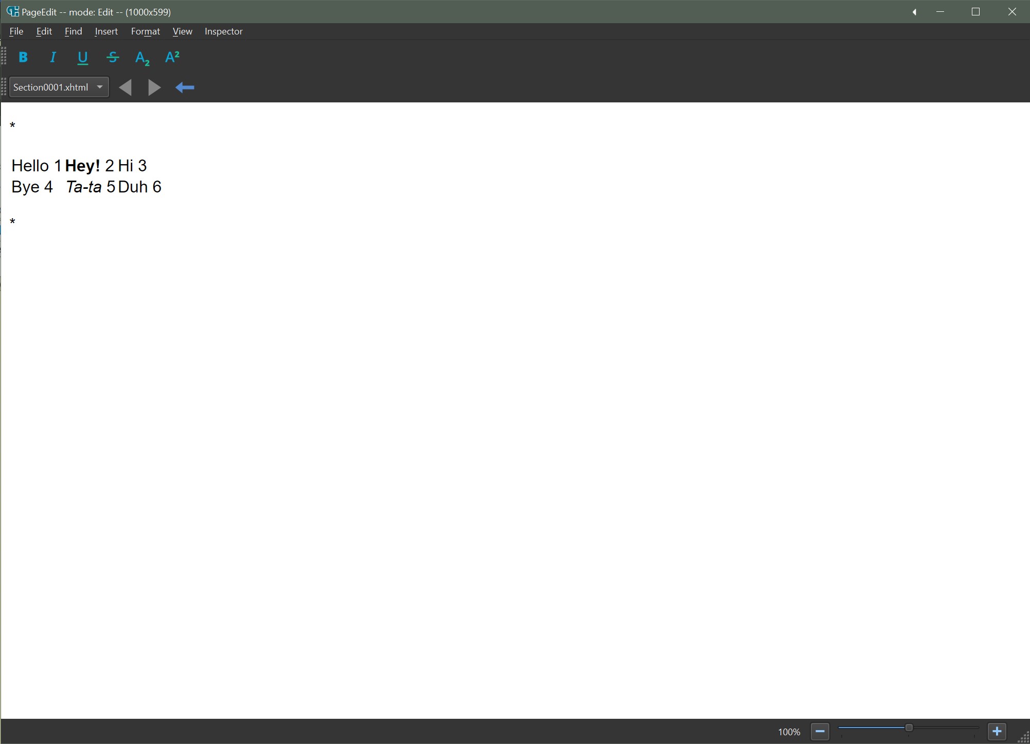 <?xml version="1.0" encoding="utf-8"?> <!DOCTYPE html> <html xmlns="http://www.w3.org/1999/xhtml" xmlns:epub="http://www.idpf.org/2007/ops"> <head> <title></title> </head> <body> <p>*</p> <table> <tbody> <tr><td>Hello 1</td><td><b>Hey!</b> 2</td><td>Hi 3</td></tr> <tr><td>Bye 4</td><td><i>Ta-ta</i> 5</td><td>Duh 6</td></tr> </tbody> </table> <p>*</p> </body> </html> Last edited by KevinH; 10-11-2023 at 04:25 PM. |