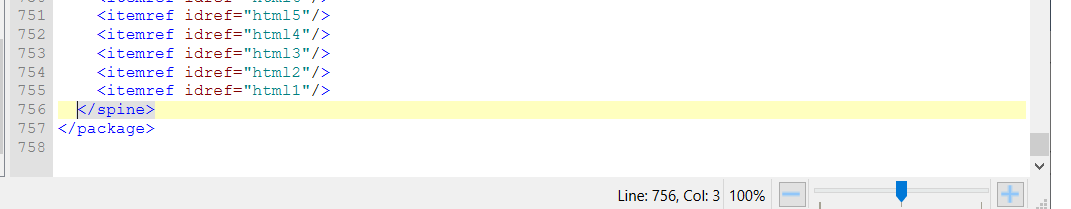 see image error ============== FATAL RSC-016 /OEBPS/content.opf (line 756, col 3) Fatal Error while parsing file: The element type "spine" must be terminated by the matching end-tag "</spine>". see image for line number pointed to is there a way to fix that now? |