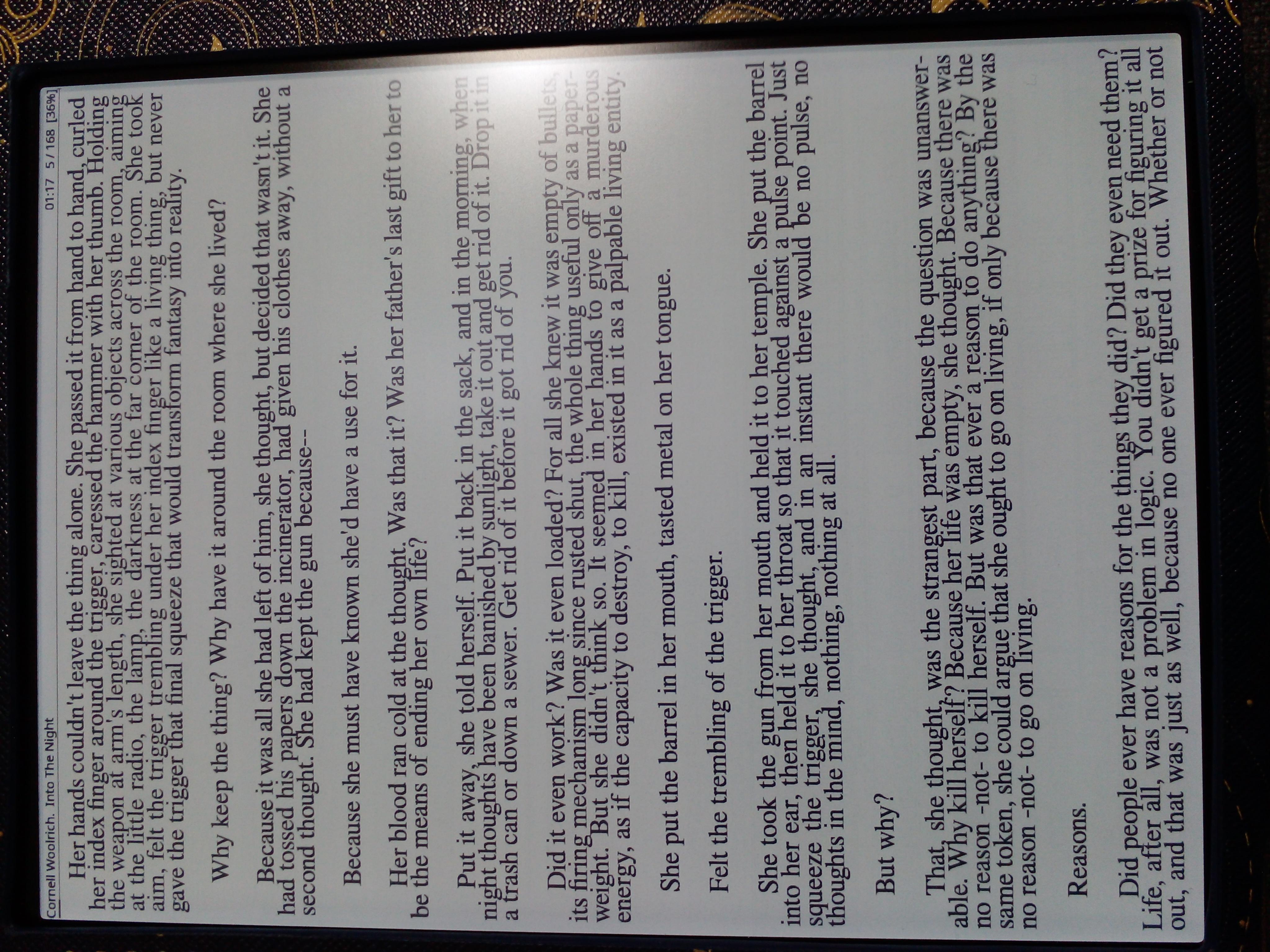 I imagine you could find some differences by laying the different readers side by side and comparing the letters under a magnifier, but not with the naked eye. Here's a couple of photos of my Era - the resolution of my camera is low, but you can see the contrast and sharpness for yourself. If they aren't good enough for everyday reading, then I don't know what is. Last edited by Xaenor; 10-23-2023 at 09:34 AM. |