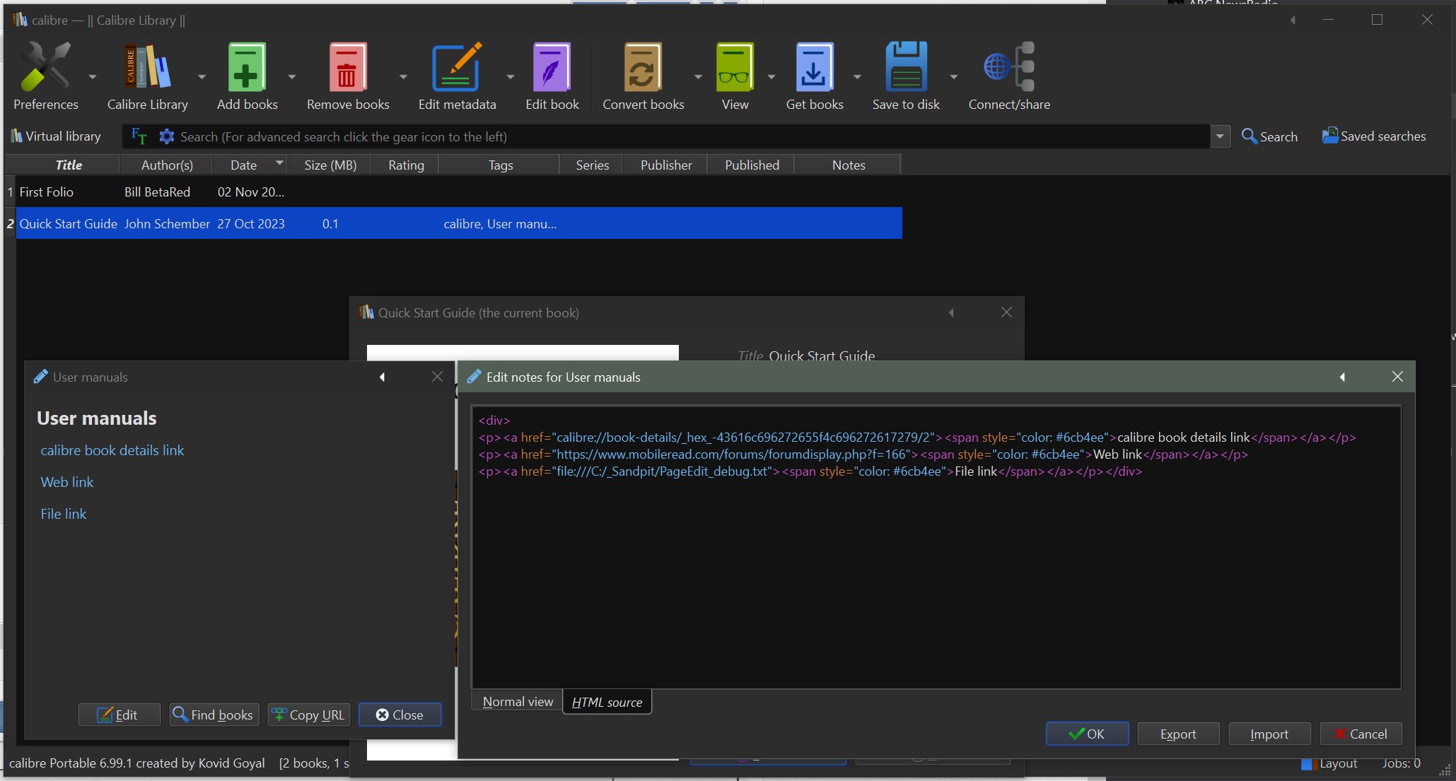 1) Editting Note in Main Calibre: It is not saved if hitting OK right after working in the HTML view (requiring to switch to Normal View first)