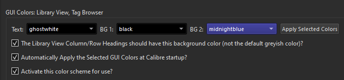 Looking at the QT-table showed me the way ;-) Find the json-file ...\Calibre\Calibre Settings\plugins\Job Spy.json make sure Calibre is closed, and just replace the line"GUI_TOOLS_LIBRARY_VIEW_ALTERNATING_COLOR": "midnightblue" with, for instance"GUI_TOOLS_LIBRARY_VIEW_ALTERNATING_COLOR": "#101010" Note that you need to redo this after every manual-according-to-the-book settings modification in the Job Spy plugin...I'm very happy! Last edited by DVdm; 11-10-2023 at 03:04 AM. Reason: clarify |
