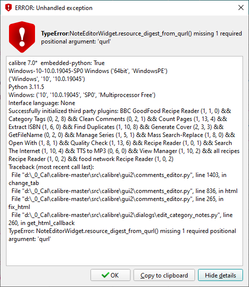About the "calibre-debug not working in version 7", same here.