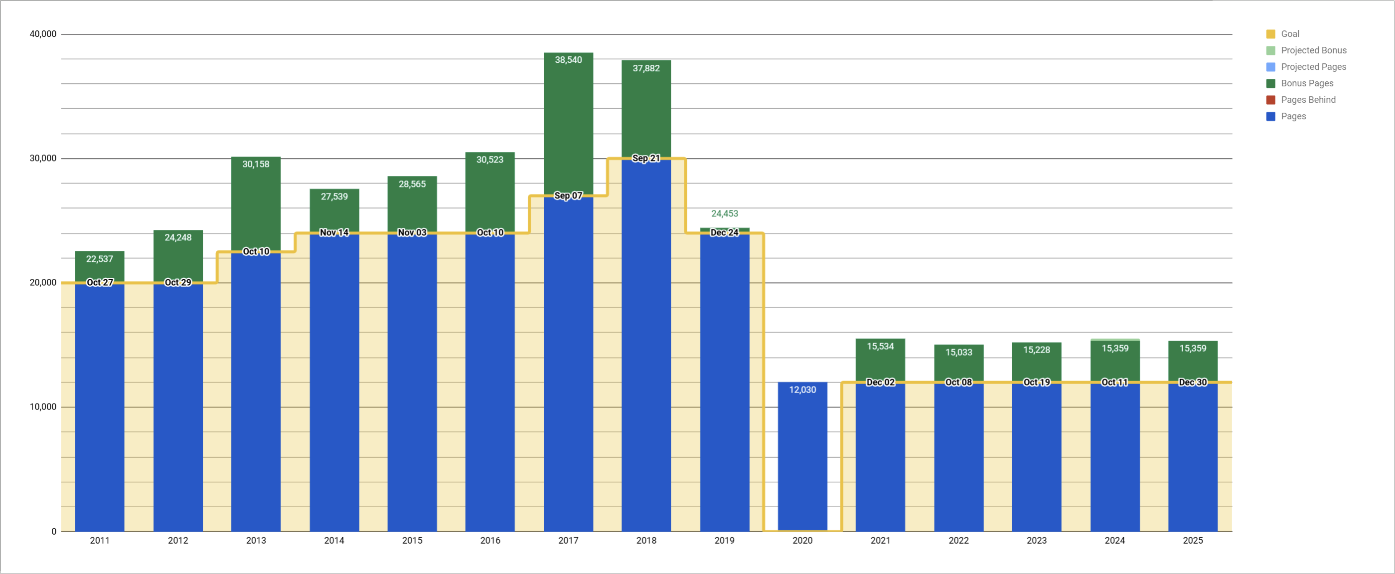 I kept the 12,000 page goal that I had used the last couple years; it seems about right for my current needs. My secondary goal this year was to catch up with the Stormlight Archive by the beginning of December in anticipation of book 5, Wind and Truth. I finished book 3 plus the intervening novellas in early November, but I didn't end up starting book 4. That will be pushed into 2025.