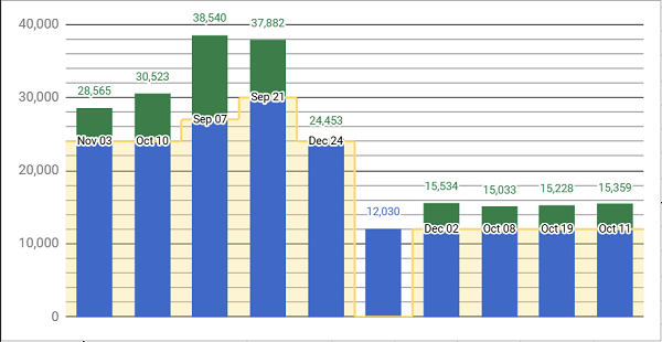 Revised targets: Gold = 2x, Silver = 1.5x, Bronze = 1x Bought: 57 Bundles: 1.5 (125 + 6 books - the 0.5 bundle is mixed media) Borrowed: 21 Free: 52 Read: 70 - BRONZE Expired: 2 Books read: 1. The Last Blade Priest - W P Wiles (k) - 547 2. Titanium Noir - Nick Harkaway (k) - 261 3. The Winter King - Bernard Cornwell (k) - 488 --- 4. Blackstone Fortress - Darius Hinks (e) - 244 5. Hell Bent - Leigh Bardugo (h) - 478 6. Roboteer - Alex Lamb (k) - 425 7. Master of the Five Magics - Lyndon Hardy (k) - 410 8. Newcomer - Keigo Higashino (p) - 322 --- 9. Home from the Sea - Mercedes Lackey (e) - 311 10. The Bloody Chamber and Other Stories - Angela Carter (k) - 167 11. The Rook - Daniel O'Malley (k) - 481 12. The Thief - Megan Whalen Turner (k) - 218 13. Round the Bend - Nevil Shute (h) - 362 14. The Siege of Skyhold - John Bierce (k) - 463 --- 15. The White Tiger - Aravind Adiga (k) - 275 16. The Justice of Kings - Richard Swan (k) - 413 17. Provenance - Ann Leckie (k) - 438 18. The Spirit Thief - Rachel Aaron (k) - 352 19. Tokyo Express - Seicho Matsumoto (k) - 149 20. The Green Man's Foe - Juliet E McKenna (k) - 366 --- 21. Decision at Thunder Rift - William H Keith Jr (e) - 302 22. The Seven Deaths of Evelyn Hardcastle - Stuart Turton (e) - 402 23. The Gathering Storm - Robert Jordan & Brandon Sanderson (k) - 825 --- 24. Wool 4: The Unraveling (novella) - Hugh Howey (k) - 125 25. Wool 5: The Stranded (novella) - Hugh Howey (k) - 181 26. Sorcerer to the Crown - Zen Cho (k) - 378 27. The Mill House Murders - Yukito Ayatsuji (k) - 247 28. Board Games in 100 Moves - Ian Livingstone & James Wallis (h) - 169 29. The Adventures of Amina al-Sirafi - Shannon Chakraborty (e) - 415 --- 30. Mercenary's Star - William H Keith Jr (e) - 378 31. The Village of Eight Graves - Seishi Yokomizo (k) - 349 32. Nine Princes in Amber - Roger Zelazny (p) - 190 (reread) 33. The First Fifteen Lives of Harry August - Claire North (k) - 404 34. Trillions - Nicholas Fisk (k) - 99 35. Moonstorm - Yoon Ha Lee (e) - 352 --- 36. Tongue Eater - John Bierce (k) - 504 37. Wine of Violence - Priscilla Royal (e) - 218 38. The Knight of the Swords - Michael Moorcock (p) - 193 (reread) 39. Dungeon Crawler Carl - Matt Dinniman (k) - 432 40. Incursion - Sarah Hawke (k) - 240 41. An Alien Heat - Michael Moorcock (k) - 178 (reread) 42. Bound (short) - Mark Lawrence (k) - 44 --- 43. Reign & Ruin - J D Evans (k) - 395 44. Dragonfall 5 and the Empty Planet - Brian Earnshaw (w) - 96 45. Green for Danger - Christianna Brand (k) - 245 46. Dungeon Diving 101 - Bruce Sentar (k) - 393 47. Goodnight Irene - James Scott Byrnside (k) - 249 48. The Black Lizard - Edogawa Rampo (k) - 176 49. Beast in the Shadows - Edogawa Rampo (k) - 100 50. Road Racer - Michael Dunlop (k) - 277 51. Atlas Alone - Emma Newman (k) - 305 52. The Atlas Six - Olivie Blake (k) - 373 --- 53. The Price of Glory - William H Keith Jr (e) - 332 54. Doctor Who and the Auton Invasion - Terrance Dicks (k) - 156 55. Bullet Train - Kotaro Isaka (k) - 451 56. Crisis on Conshelf Ten - Monica Hughes (w) - 143 --- 57. The Curse of the Mistwraith - Janny Wurts (i) - 800 58. Godkiller - Hannah Kaner (e) - 290 59. The Last Devil to Die - Richard Osman (h) - 417 60. Alien Clay - Adrian Tchaikovsky (k) - 388 61. Doctor Who and the Dalek Invasion of Earth (k) - 142 --- 62. Siege and Storm - Leigh Bardugo (k) - 382 63. Gate of Ivrel - CJ Cherryh (w) - 191 64. Some Desperate Glory - Emily Tesh (k) - 436 65. The Inugami Curse - Seishi Yokomizo (k) - 316 66. Street Cultivation - Sarah Lin (k) - 390 67. Defiant - Brandon Sanderson (k) - 413 68. Gateway - Frederik Pohl (p) - 276 69. Sixteen Ways to Defend a Walled City - K J Parker (k) - 376 70. The Moon Raiders - Patrick Moore (p) - 124 Monthly Breakdown: Spoiler: