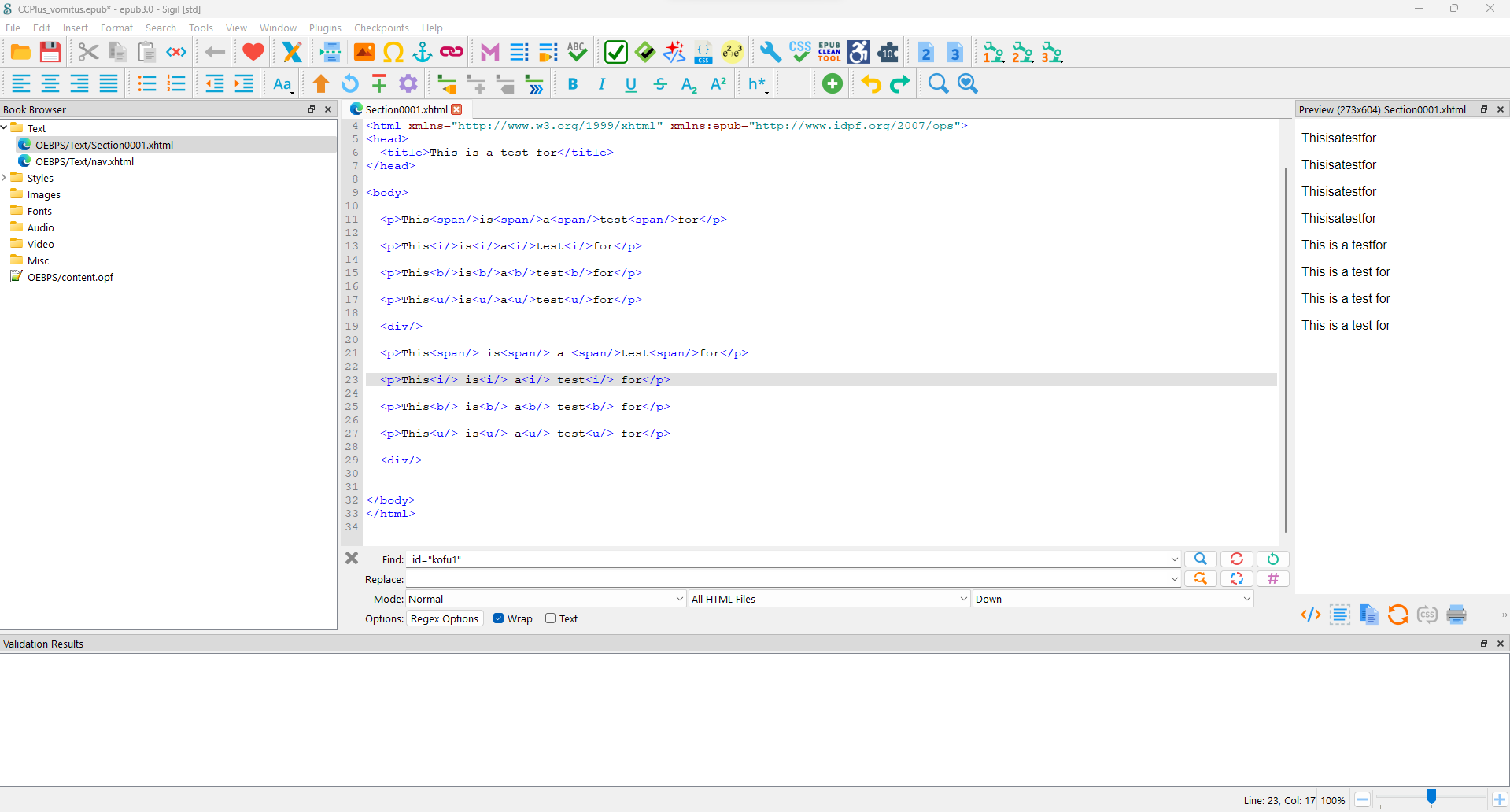 This is a test for And here is the text after preview: This is a test for There doesn't seem to be a problem on my side after I run the plugin in a test epub with your code. Quote: