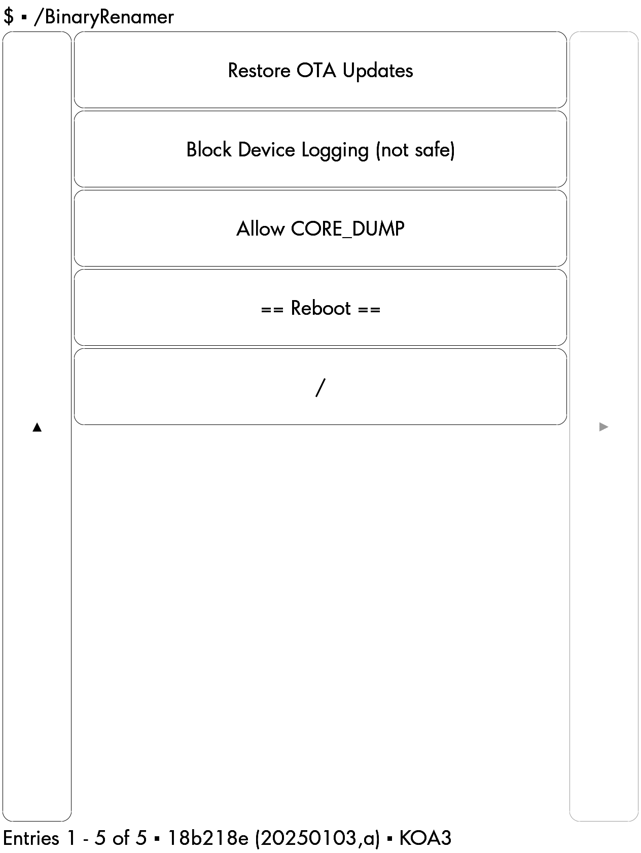 BinaryRenamer Block OTA Updates and Device Logging Screenshots: ————————————— Important: ————————————— • Use at your own risk! • If you are new to jailbreak, turn off WiFi! (via Aeroplane/Airplane mode). • Remove the update.bin.tmp.partial file (if it exists) from the Kindle root directory. • Tested and works on these devices: - Oasis 3: 5.16.2.1.1, 5.13.6, 5.17.1.0.3 • Warning! Block Device Logging does not work in PW1 and PW2. Avoid using this option or your system will brick. - Reported in: #34, #56 If you experienced this problem, and you have soldering skills, then check this unbrick method. Usage: ————————————— Block OTA Updates: Spoiler: