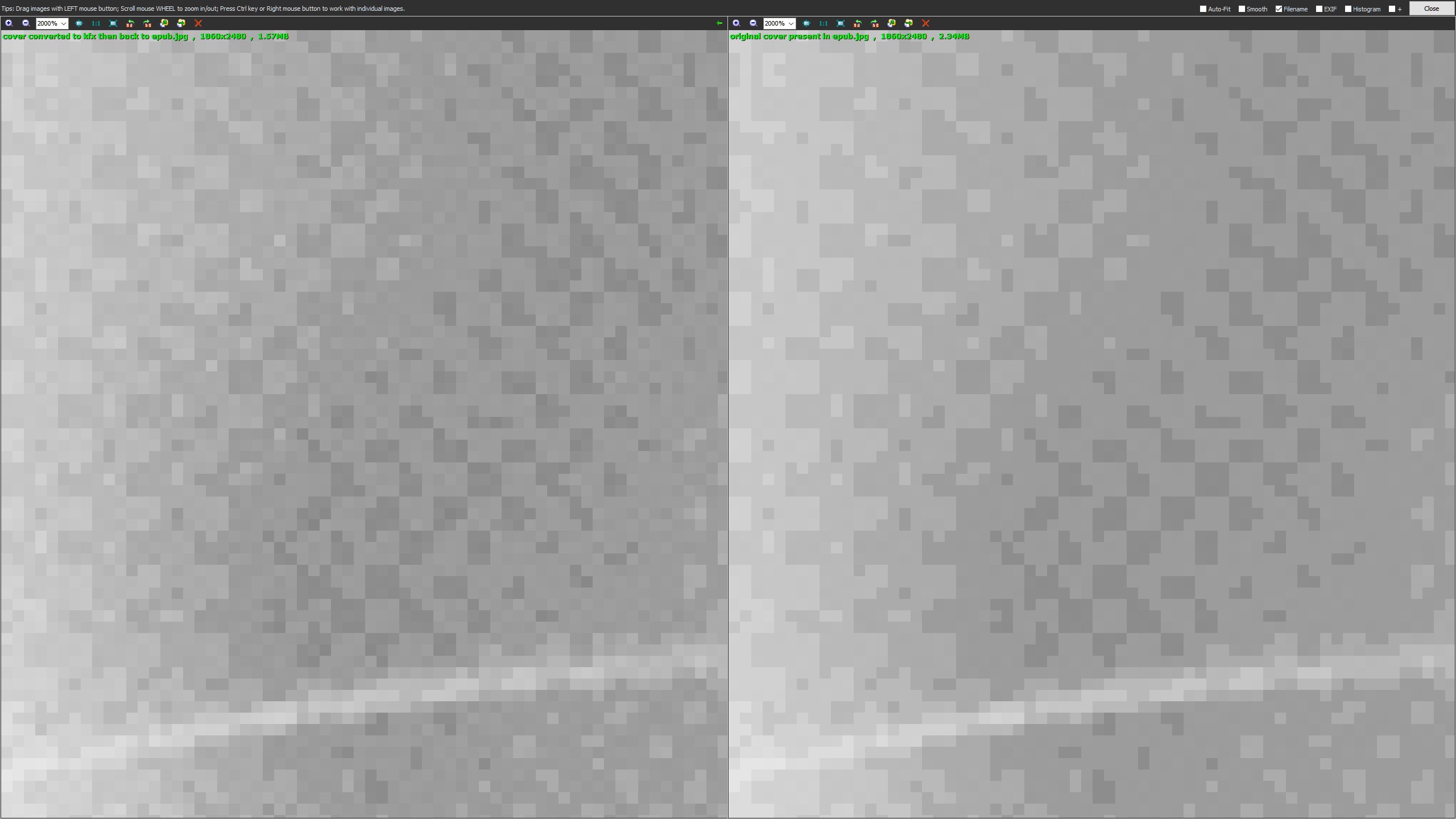 - So I did a few more tests, and there is quite a bit of difference in files saved in photoshop and ones saved in Faststone. So there really must be something with the way .jpeg files are saved. I used same 2col.png as source. I opened it in Photoshop, changed it from grayscale to rgb, then saved it as jpeg at max possible quality. File size was 15mb. I packed that file into .epub. I again did .epub to .kfx and back to .epub using CLI. And resulting jpeg file was 5mb smaller, and went from 8 colours to 22 colours. I also did the same but kept the file in grayscale. Resulting file was of slightly different size. In both cases it was practically impossible to spot differences compared to original .jpeg that was generated in Photoshop, but it wasn't identical. Going by the Faststone procedure, files were identical. Puzzling.