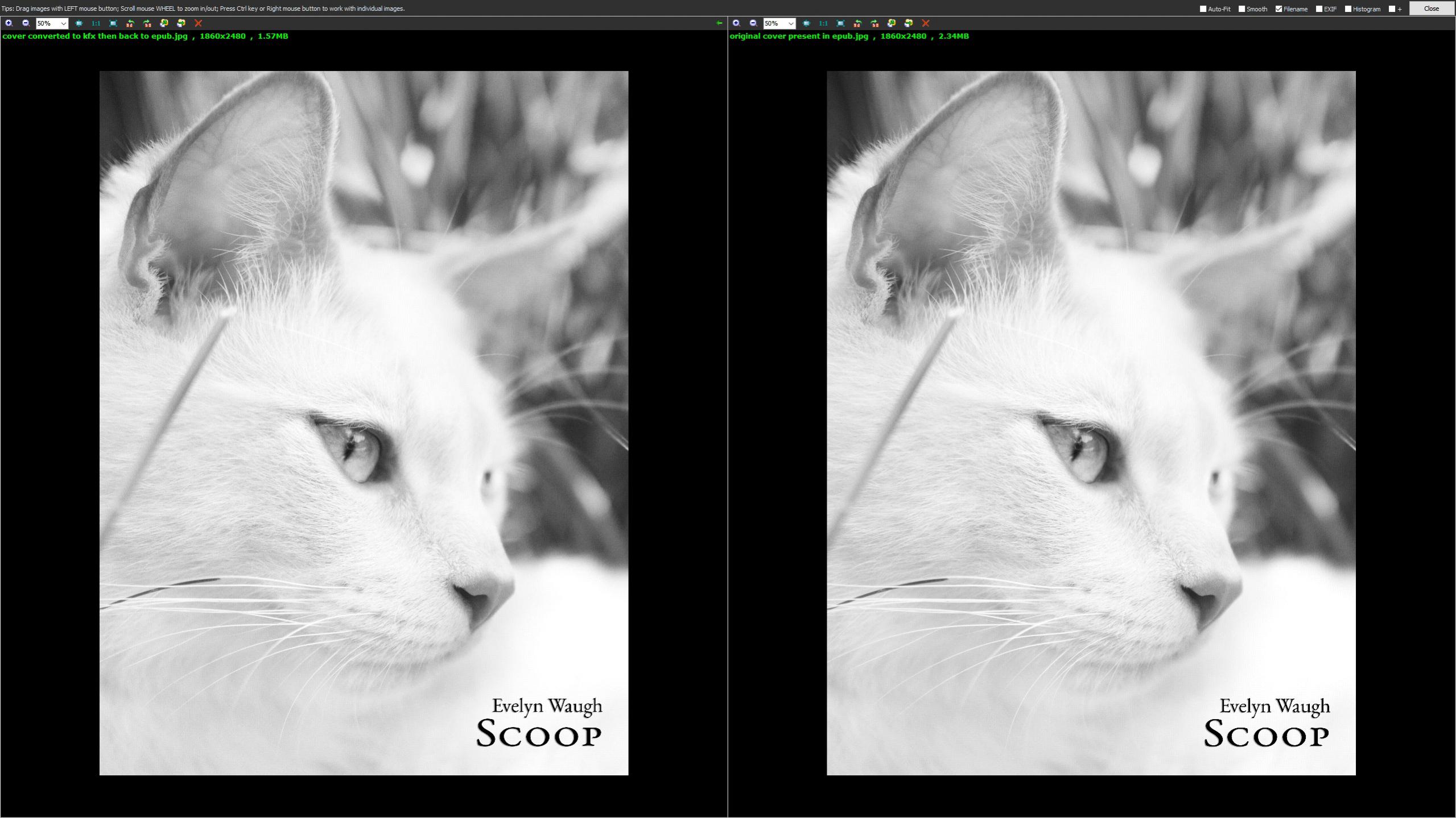 I replaced cover present in "pg308-images-3.epub" with "PNG to JPEG Vile Bodies.jpg". I just manually opened .epub in file explorer, and replaced it. Exactly the same conversion as before. Results are not identical. New file is slightly smaller, Faststone reports that it has 21 colours compared to 13 of the original file, but differences are practically impossible to spot.