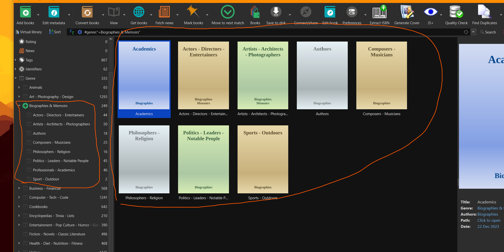 My biography books are all sorted in sub genres, rather than having to go through the side hierarchical list, I can navigate through the sub genres within the cover grid. Double clicking one of those "books" takes me into that specific sub genre where I can see all of the books. The only downside to my method is that an error pops up every time it opens the shortcut file (though it does work to navigate me to where I want to go). This is where I thought a plugin might be able to streamline this better. After redirecting me, the popup error says "failed to read book data from calibre library" which makes sense as it is a shortcut file After double clicking "Actors - Directors - Entertainers" Last edited by BetterRed; 12-23-2023 at 04:32 PM. Reason: move inages to MR |