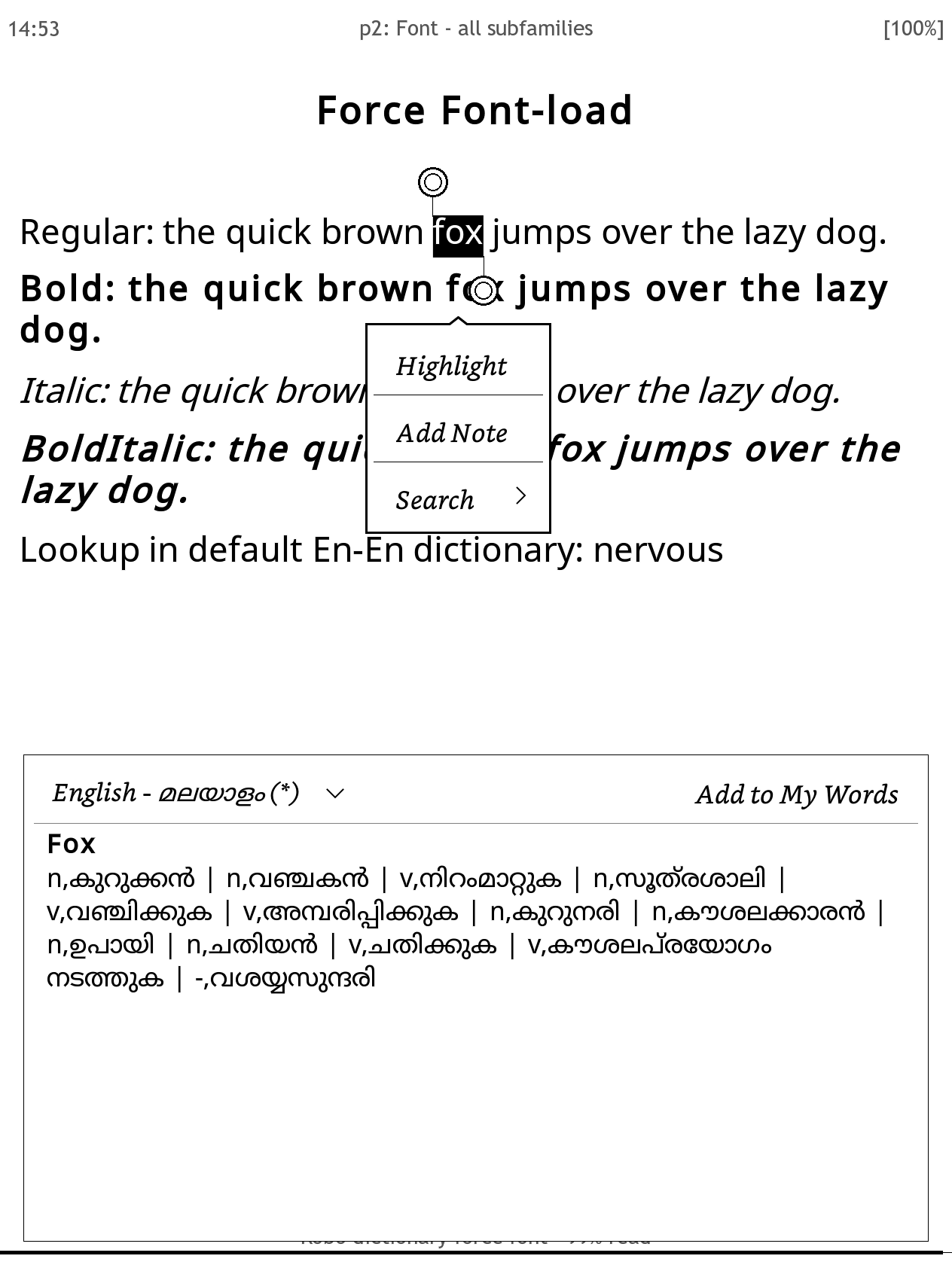 It doesn't seem to matter which epub/kepub I open/re-open, if I do a dictionary lookup (any dictionary) the word definition uses the Malayalam Regular font for the parts of the definition which are intended to be displayed as Regular. I don't know how to fix the dictionary label's Malayalam characters but if it's a problem, a simple renaming of dicthtml-en-ml.zip may be the easiest workaround.