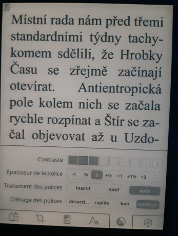 In short, the contrast against the previous models is of course good, but against the Kobo or Tolino (for models with E-INK Carta 1200 type screen), the contrast is not so pronounced, which quite surprises me, that's all. "" But I think it's intentional on Pocketbook's part, since strong contrast can be too aggressive for some readers and PB doesn't offer the possibility of font contrast in the settings, so they chose a compromise. "" Last edited by Michal Jancik; 12-28-2023 at 08:20 AM. |
