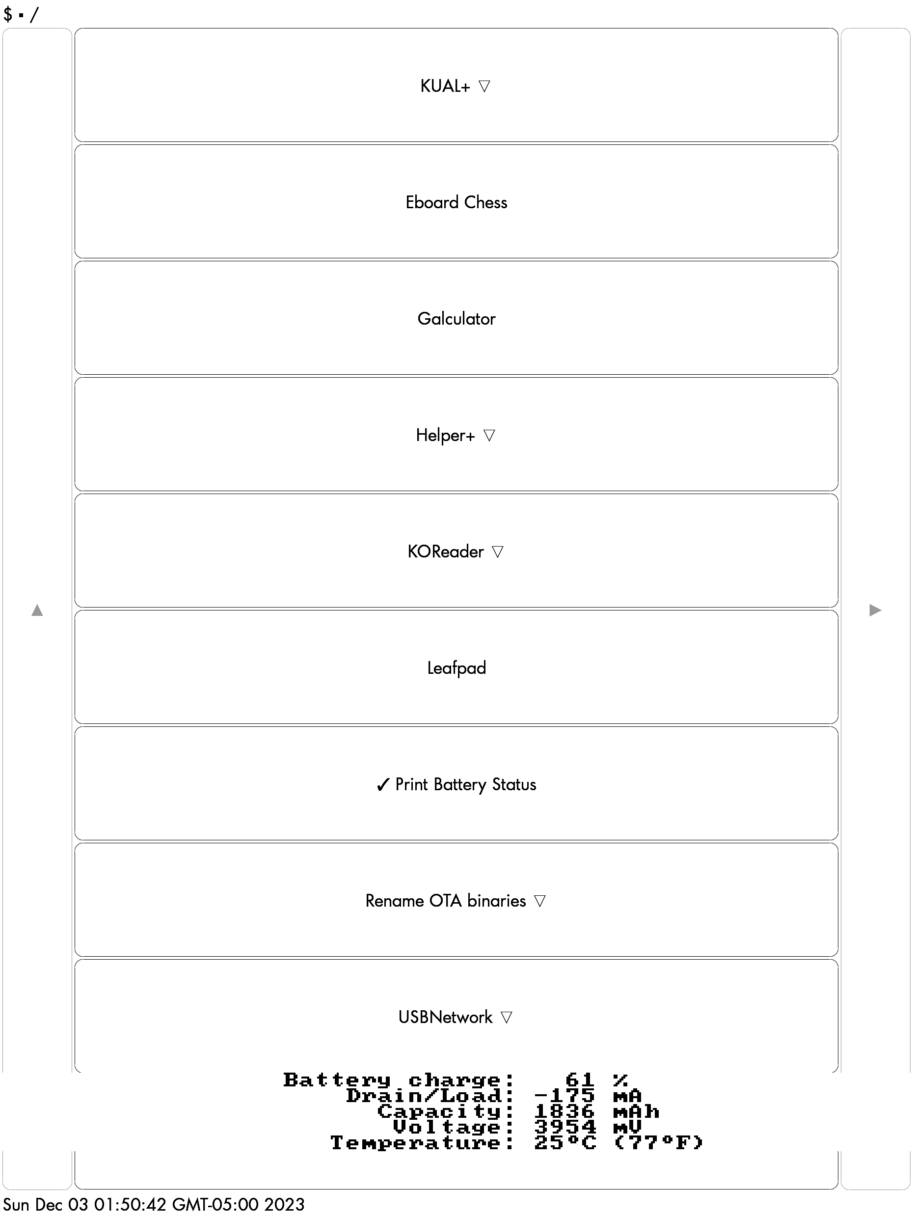[root@kindle bin]# gasgauge-info -c 100% [root@kindle bin]# gasgauge-info -l -49 mA [root@kindle bin]# gasgauge-info -m 1074 mAh [root@kindle bin]# gasgauge-info -v 4281 mV [root@kindle bin]# gasgauge-info -k 242 #24.2°C? Last edited by juliazero; 12-03-2023 at 03:29 AM. |