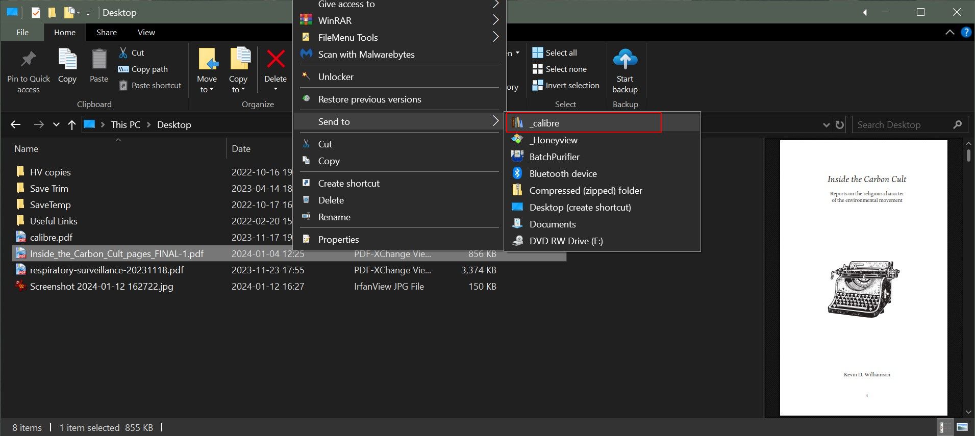 Have you installed the JobSpy plugin? It has a per library tweak for AutoAdd: Another possibility is the Windows Send to menu: The _calibre item I've boxed is a shortcut to calibre.exe, if I clicked it as shown, the Inside the Carbon Cult PDF would be added to the current library. Send to is the primary mechanism by which I add books. Like most engineers (ChemEng in my case) I don't like inexplicable phenomena. He might move in mysterious ways but the things He's alleged to have created don't do that… not even nuts that fall off drawer handles. BR Last edited by BetterRed; 01-12-2024 at 02:02 AM. |