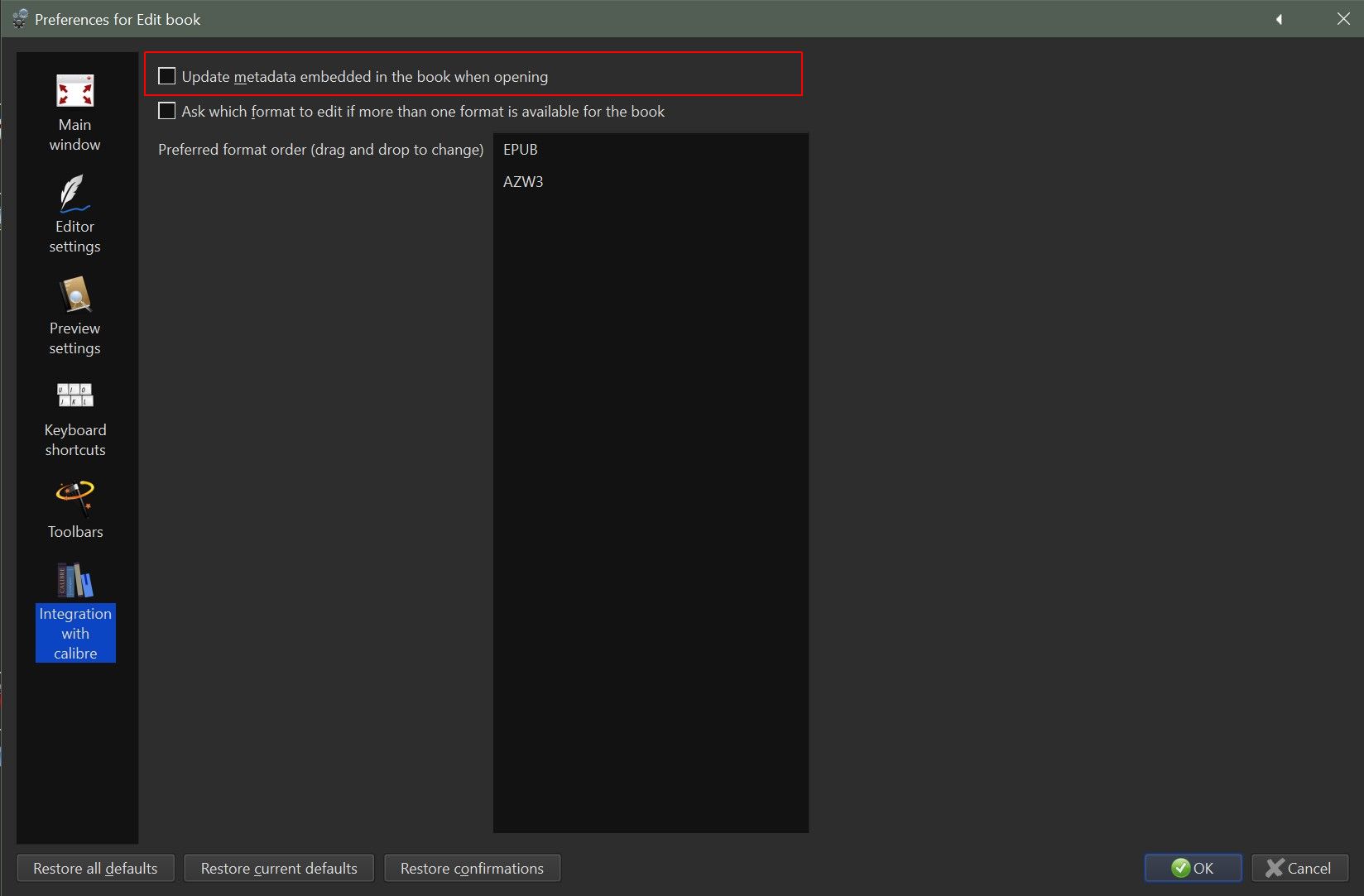 If you dont want running the editor to update the metadata in the file turn it off in the calibre integration section of the editor preferences.