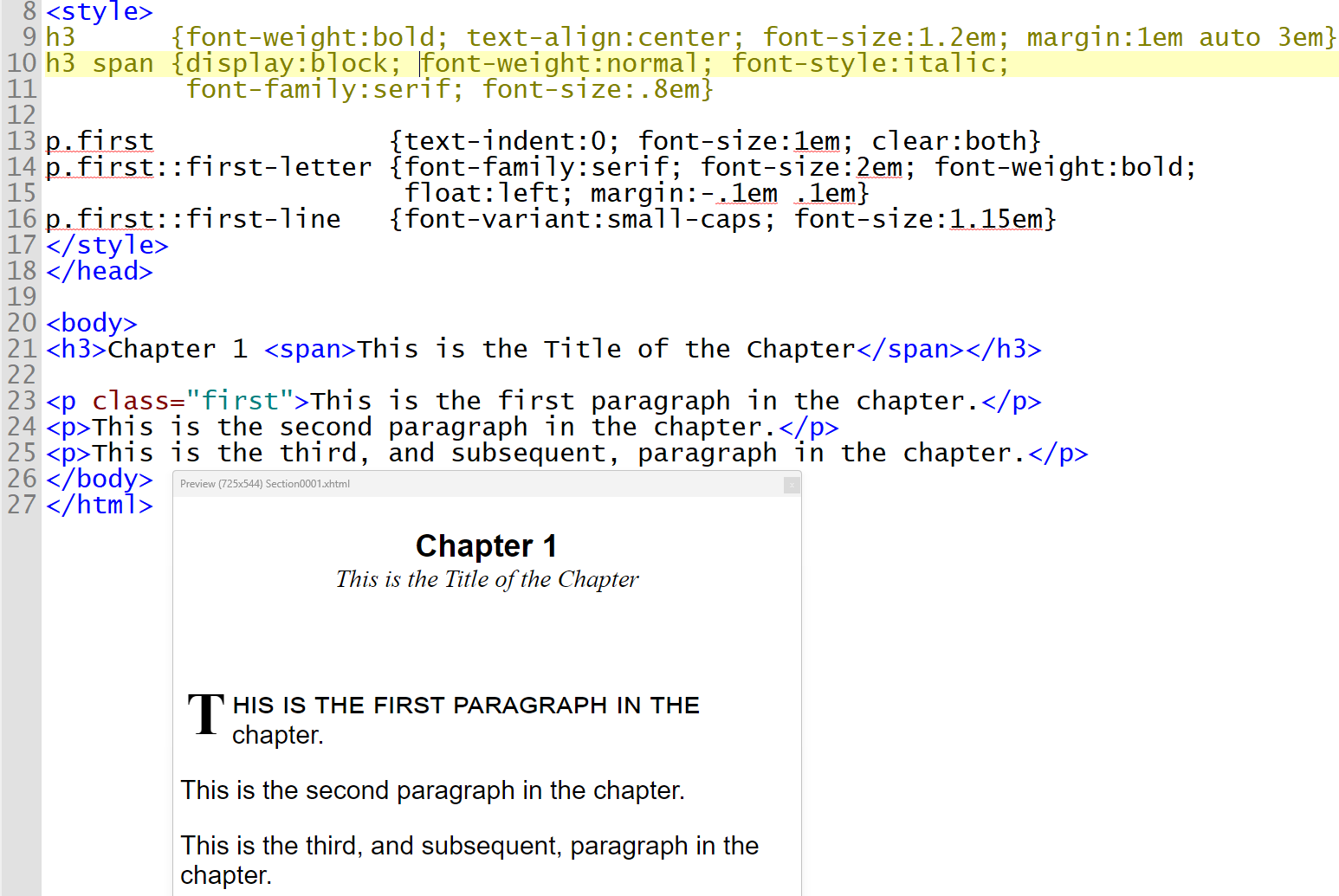 Onto the HTML. Your ID's do nothing so you don't need them. You also don't need an <a> that does nothing but holds an id that does nothing. If in your ToC, you have these ID's, then get rid of them. If your ToC entries are going to the top of each HTML file then forget IDs. They will slow things down as the Reader has to load the HTML and then go find the ID instead of just loading the HTML and starting from the top. Also, that's code bloat when you have code that does nothing. I changed the second line in the chapter header to be a <p> because then it won't be used if you use calibre or Sigil to generate a ToC from your headers. The title= I put in will be the ToC entry if you do generate a ToC from calibre or Sigil. The thing is, once you export your book from InDesign as an ePub, you will need to hand edit the code. After you've done this you and you make changes to the text in InDesign you will want to make the changes to the ePub and not generate a new ePub as you will then have to once again hand edit the code. InDesign can make some rather messy code. I've edited a lot of eBooks that came from InDesign and they messy. When you hand edit, I suggest you change class names to make sense if any of the InDesign classes don't make sense. Do you need an embedded font for the chapter titles? If you do, change the font family names to the names of the font(s) being used. But you don't need two different fonts for the chapter title. That's ugly. [code] Code: