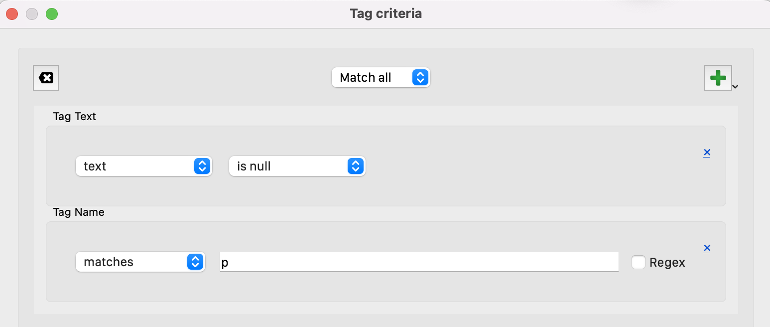 One other question: Is it possible to delete tags with no text inside? Like empty paragraphs or empty spans? I tried to use Tag Actions with the configurations in the attached images, but it doesn't remove any tags, even ones with nothing inside. If I should be able to do this, what am I doing wrong? |
