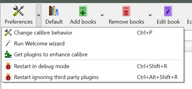 This is what I currently see in the Preferences drop down: This is what you posted Restart in Debug mode is missing in your screen shot. Restart Options We have two restart options in the Preferences tool drop down menu, Restart in debug mode and Restart ignoring third party plugins, and we have the single action Restart tool. I suggest the Restart action be moved into the Preferences drop down with the other two Restart actions and the separate Restart tool be scrapped, OR move the two Restart options in Preferences into a drop down on the Restart tool. If I were my decision I would choose the first option because I think it would create less "where did the Restart options go" complaints. This is a calibre-debug issue - on a number of occasions I've wanted to run calibre in debug with no third party plugins, the way I've been doing it is to run a fresh install of portable in debug. If calibre-debug had a --ignore-plugins option we could have a another Restart option - Restart in debug mode ignoring third party plugins. Running a fresh install of portable in debug with no plugins installed is not quite the same even if I copy my 'install' preferences into calibre portable. BR |
