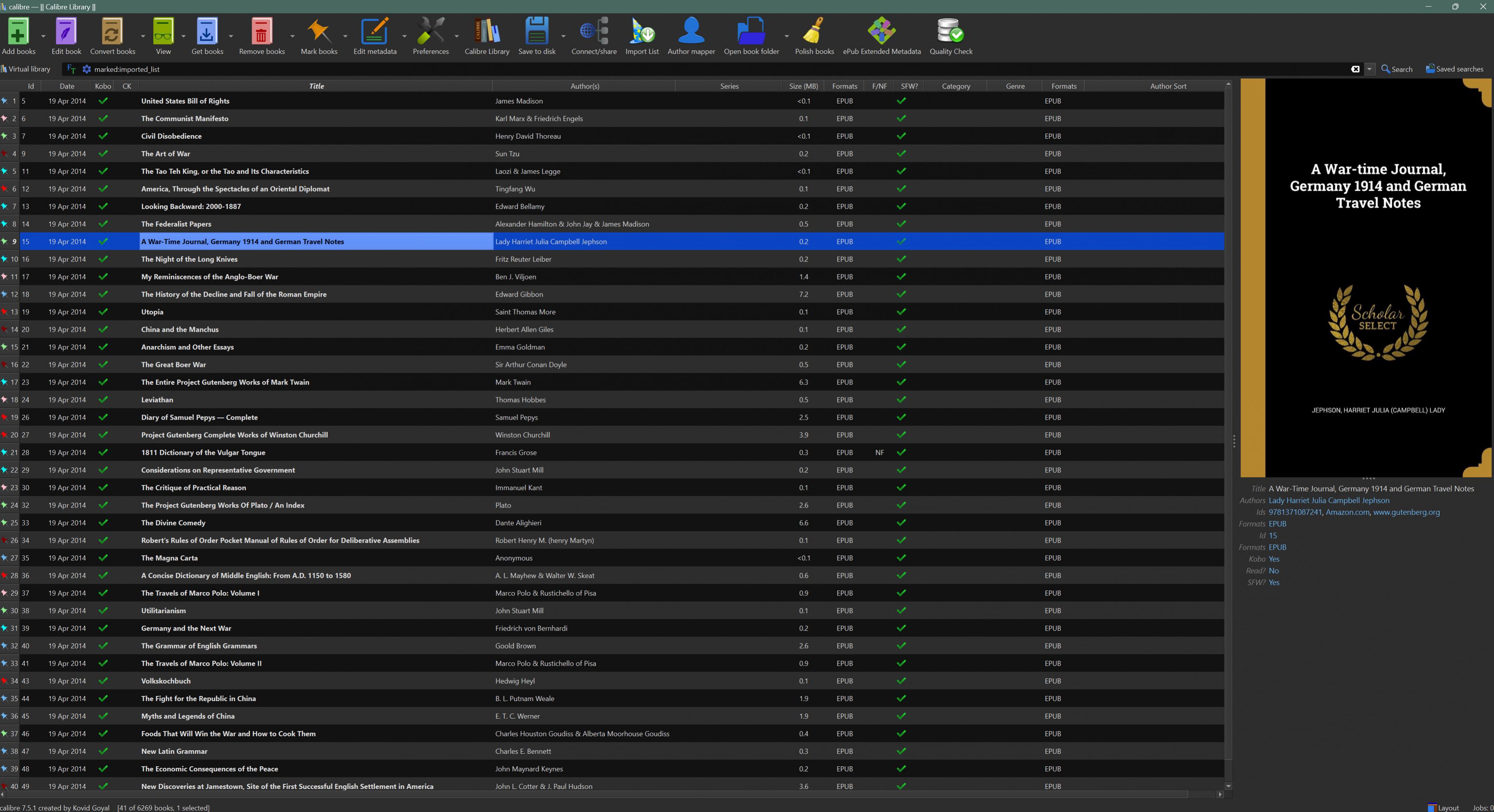 I use a few custom columns, in the attached example I'm using #collections to group things like the various ebook Humble Bundles I pick up. As you can see the tags column is quite wide, and my custom column is the one at the end. Changing the order of columns in the csv seems to have no effect on the order, any custom column populates to the right of the mandatory columns in that table. Last edited by Wolgan; 03-23-2024 at 01:59 PM. Reason: spelling |