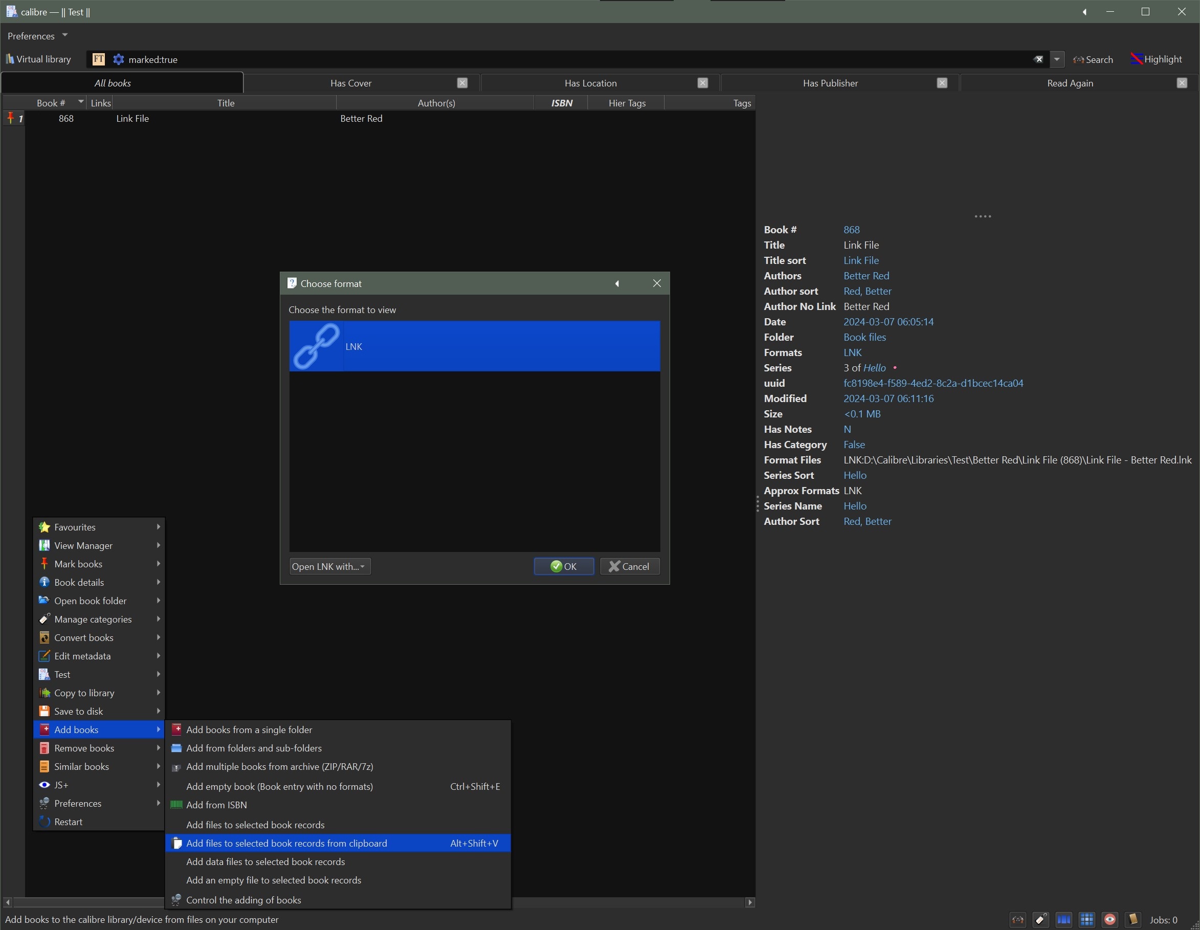 AFAIK that is the only Add books action that will add the actual LNK file, all other Add books actions, including drag-n-drop into Book details, will add the shortcut target. BR Last edited by BetterRed; 03-06-2024 at 06:08 PM. |