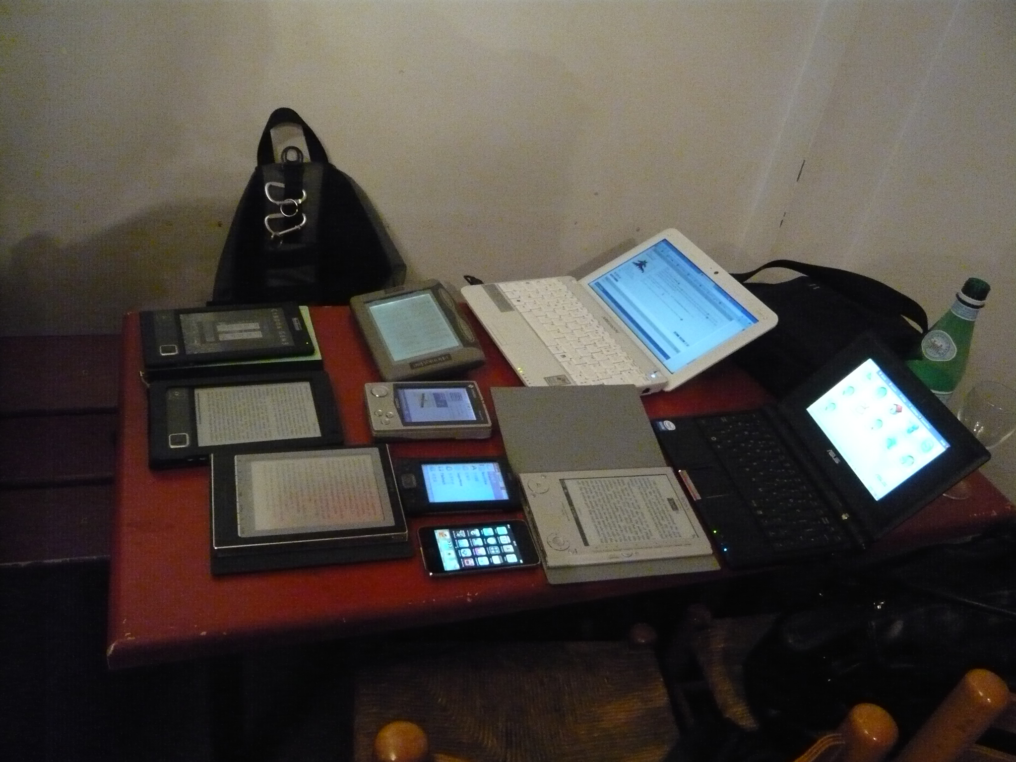 ) mais je confirme, la soirée fut un immense succès !! nous nous sommes retrouvés entre amis pour parler liseuses, ebooks, et... cuisine, bien sûr (entre autres). Polyglot nous a épaté avec son "book d'ebooks", avec des photos de tous les modèles disponibles et annoncées, en plus de quelques prototypes dont on n'a plus eu de nouvelles (hélas). nous avons aussi été ravis de rencontrer une éditrice qui monte sa maison d'édition actuellement avec le projet d'éditer des ebooks de tous genres ! en voilà, une bonne nouvelle pour nous lecteurs francophones, frustrés devant la relative pénurie de livres contemporains disponibles en format numérique ! elle a promit de nous retrouver ici sur le forum pour nous tenir au courant de l'avancement de la chose. et bien sûr, Nicolas d'actualitté est venu trinquer à un rapprochement de nos deux sites dont nous en reparlerons ! c'était un vrai plaisir de rencontrer enfin le responsable de ce site que nous connaissons sûrement tous ! et j'ai hâte de rediscuter avec lui de nos projets communs. un remerciement tout particulier à lui et son équipe d'avoir répercuté l'info sur son site, ce qui a permis à d'autres personnes de découvrir mobileread par le biais de l'apéro, dans un renversement de situation plutôt amusant ! pour ceux qui n'auront pu y assister, et comme petit souvenir pour les présents, voici quelques petites photos (merci YGG !). vous pouvez aussi suivre les événements (presque) coup par coup (mais en anglais) dans le fil que l'intrépide YGG a animé sans faillir même devant un plat appétissant de pâtes fraîches ! rendez-vous le 4 juillet pour le suivant !! inscrivez-vous dès maintenant et marquez la date d'une pierre blanche ! venez nombreux !!! |