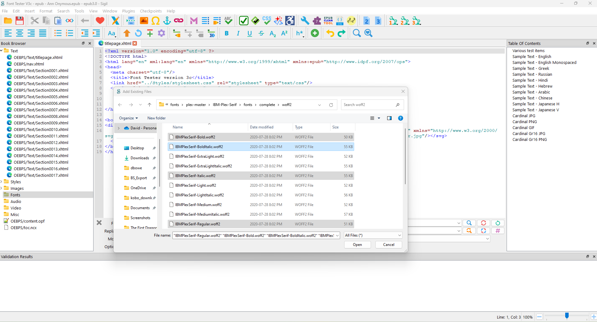 I added the fonts using the Add existing files tool and no issues. I added the @font-face bits and bobs to the stylesheet, added the serif font family to the <body> class and the mono font family to the <code> class. All looks good and other than complaining about my use of webkit extensions, Sigil seems happy enough. Please note that this did not require adding the WOFF2 files to the Windows Fonts. I just unzipped the Plex-master.zip to a folder and browsed to the files. I've attached the epub file. Last edited by DNSB; 03-06-2024 at 08:38 PM. |