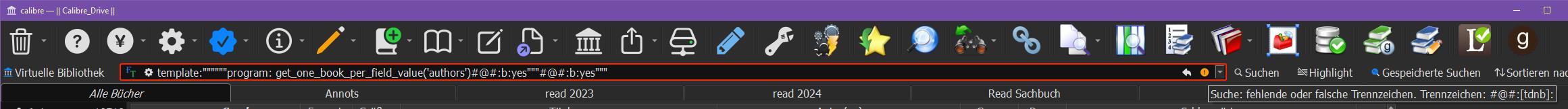 Running from source, I've just tested template:"""program: get_one_book_per_field_value('authors')#@#:b:yes"" " tag:fantasy template:"""program: get_one_book_per_field_value('authors')#@#:b:yes"" " tag:biography f:ep Both return only one title per author. ![]() edit to add: it works also on latest preview version, by the way! Last edited by Comfy.n; 03-13-2024 at 03:11 PM. |