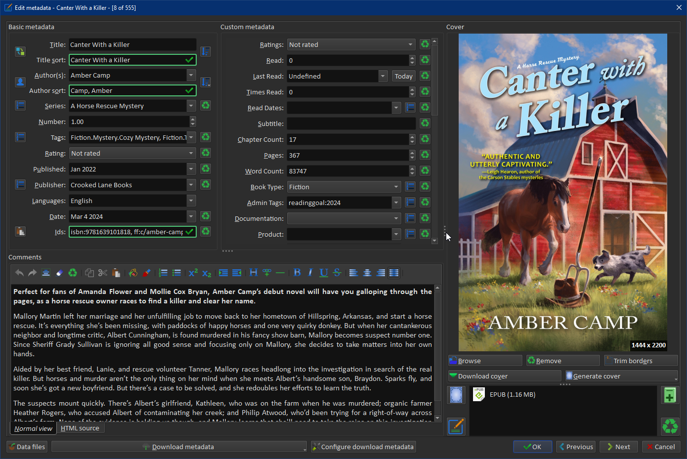 However, it would appear that regardless of this, the large section still appears in the metadata editor: This section cannot be resized, since the border between "Basic metadata" and "Custom metadata" is not draggable. I can only make the "Cover" section larger, which doesn't help me at all. I have a lot of books with long titles so this large "Custom metadata" section is completely in the way. In the first place I don't think it makes any sense that this section appears even though it's completely empty because I deselected the one custom column in preferences. But I would at least like to resize this empty section so that it doesn't take up so much space. |