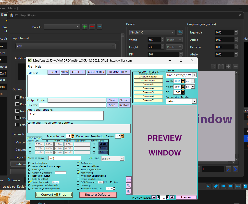 its missing the plugin does seem to be missing settings that the program has like that OCR (Tesseract) feature it has within the program itself the plugin is missing that and its missing Fixed output font size, which I am not sure that even works or not, I don't really know if it affects pdf fonts in the images at all, but without OCR on the pdf files cannot use in edge and read aloud feature doesn't work for pdf without having OCRing the pdf , which does work well with pdf and text to speech, for me, it's one of the few OCR apps that seem to work well, it's a nice idea this plugin but I do think it needs work I guess. I have x64 version of Calibre 7.5.1 and the 32x bit version calibre-5.44.0 for the text to speech voices that don't show up in Calibre's Ebook Viewer on the x64 app, both seem to work fine together, this plugin was added in 7.5.1 build of Calibre software, I am guessing the person who also has it installed is using the current version too on their pc. I had to manually setup a save for Presets: Default profile, as it didn't come with a save value and each time I open k2pdfopt Plugin I have to reopen the Default profile, otherwise it doesn't remember my settings when the plugin is opened, that might need to be fixed in future builds, again I like the idea of this plugin it just needs some updates, looking forward to seeing its progress, and thanks for the plugin ![]() https://www.willus.com/k2pdfopt/ https://www.willus.com/k2pdfopt/download/?-1 https://willus.com/k2pdfopt/contrib/ So, I tried that k2pdfoptgui 2.0 from k2pdfoptgui2_1_0_0,zip from contrib website it seems to get this message with the official 64bit downloads, it doesn't seem to want to output a pdf from that software? ok I think it doesn't work since it was last updated Last update: v2.1.0.0, Jan 2014 which is older than k2pdfopt.exe 2.55 version, I guess that makes sense why it doesn't work anymore, not sure why there is still a link to it on that page? Quote: