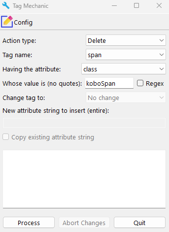 As explained, when tags are nested like spans can be, regex can get confused. That is why I tried to suggest using the TagMechanic plugin may be easier. I assumed you have a basic understanding of how to find, install, and use Sigil plugins. If not, our Sigil User Guide may help. if you still want to try with regex, others in the regex thread can certainly provide some help. |