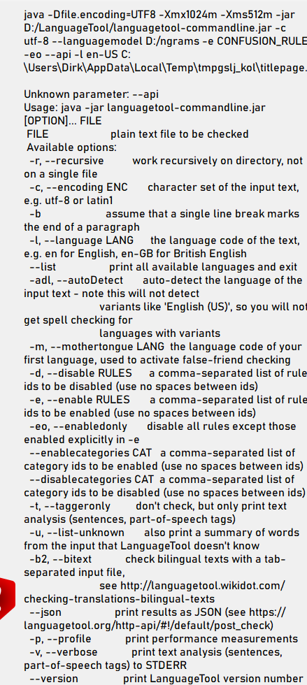 Calibre 7.8 Sigil editor 2.1.0 Language Tool Plugin: latest version Language Tool version 5 and version 6 When I use the language Tool Plugin with version 5 of the language tool, it works without problem in the Calibre Editor and in Sigil Editor. However, when I use the plugin with the language Tool version 6, it does not work in Calibre Editor, but it does work in sigil editor. In the Calibre editor, I get the following error message: see attachment Is there a way to solve this? |