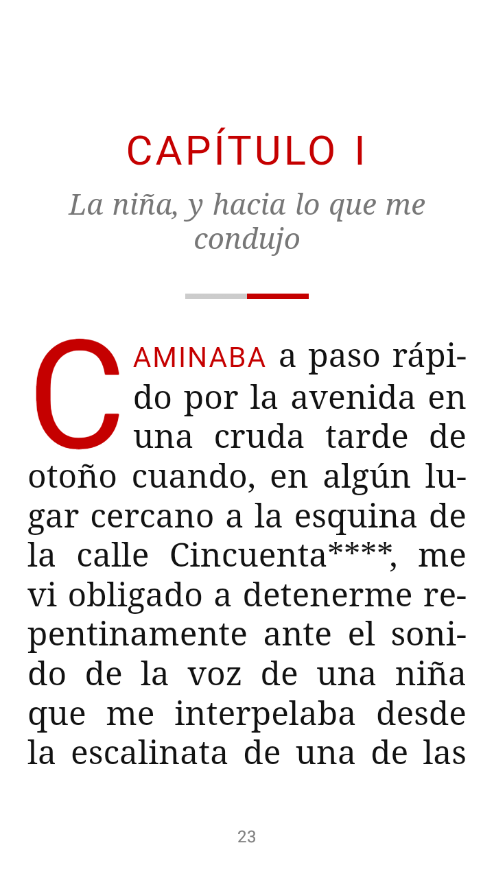 Regarding your second statement, I wrote here many times that an epub must be an epub3 with fallback code for epub2. Your simply formatted novel to me is a challenge to convert it in somethimg more elaborated, with nice chapter headings, dropcaps, fleurons, etc., etc., etc. Here you have two screenshots of a simple novel of mines: The dropcap is controlled by javascript so always it has a perfect size (on epu3). Last edited by RbnJrg; 04-27-2024 at 09:06 AM. |