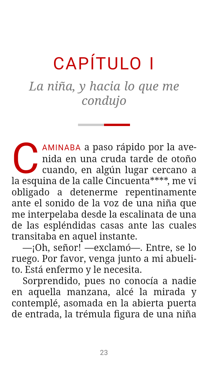 Regarding your second statement, I wrote here many times that an epub must be an epub3 with fallback code for epub2. Your simply formatted novel to me is a challenge to convert it in somethimg more elaborated, with nice chapter headings, dropcaps, fleurons, etc., etc., etc. Here you have two screenshots of a simple novel of mines: The dropcap is controlled by javascript so always it has a perfect size (on epu3). Last edited by RbnJrg; 04-27-2024 at 09:06 AM. |