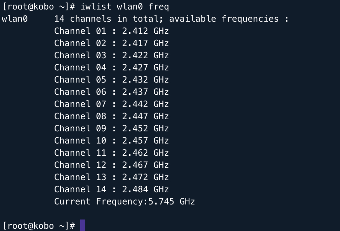 As far as commands go, Kobo uses BusyBox, so you're limited to the commands it supports, unlike with a full Linux distro. Thankfully, at least iwlist is available for diagnosing this. |