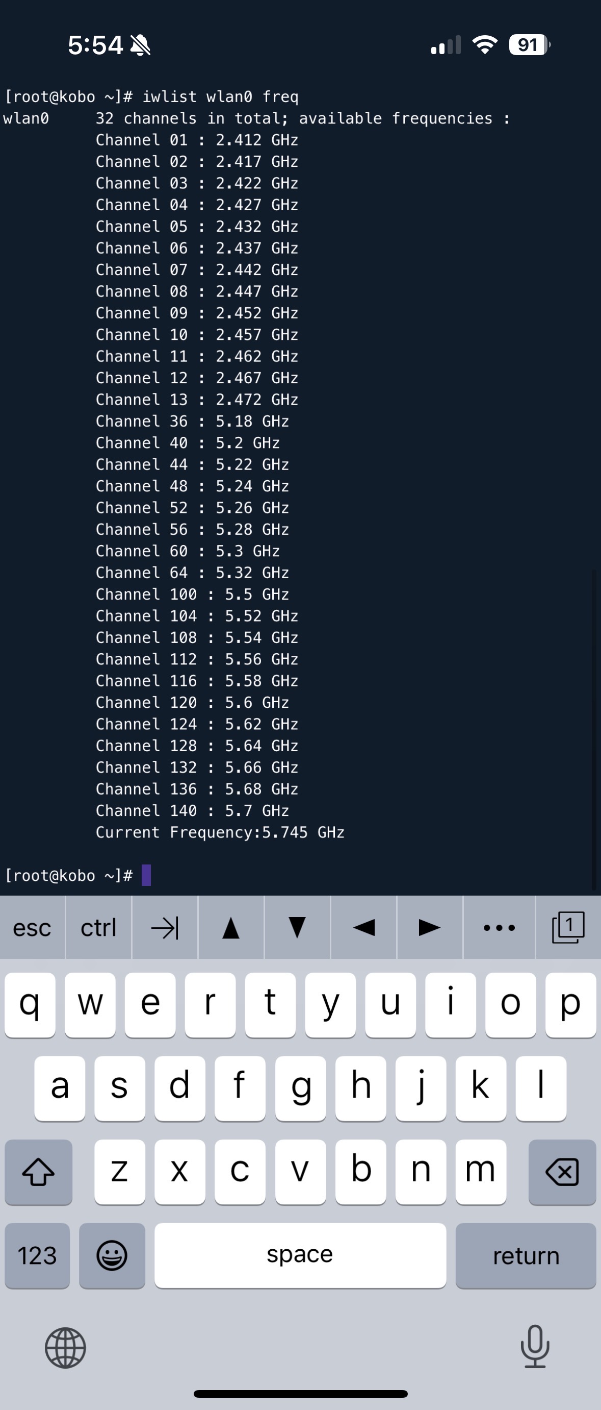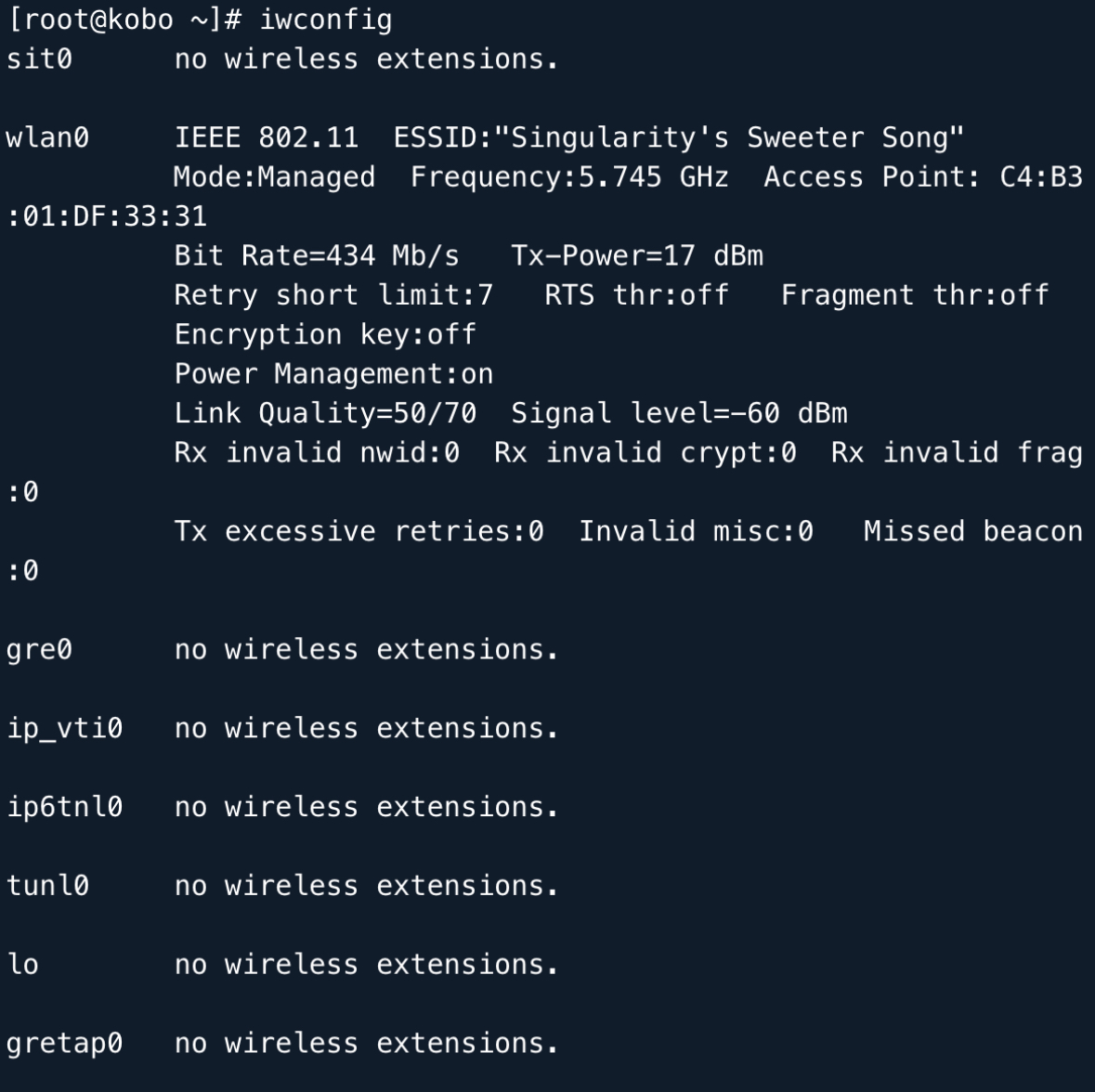 As far as commands go, Kobo uses BusyBox, so you're limited to the commands it supports, unlike with a full Linux distro. Thankfully, at least iwlist is available for diagnosing this. |