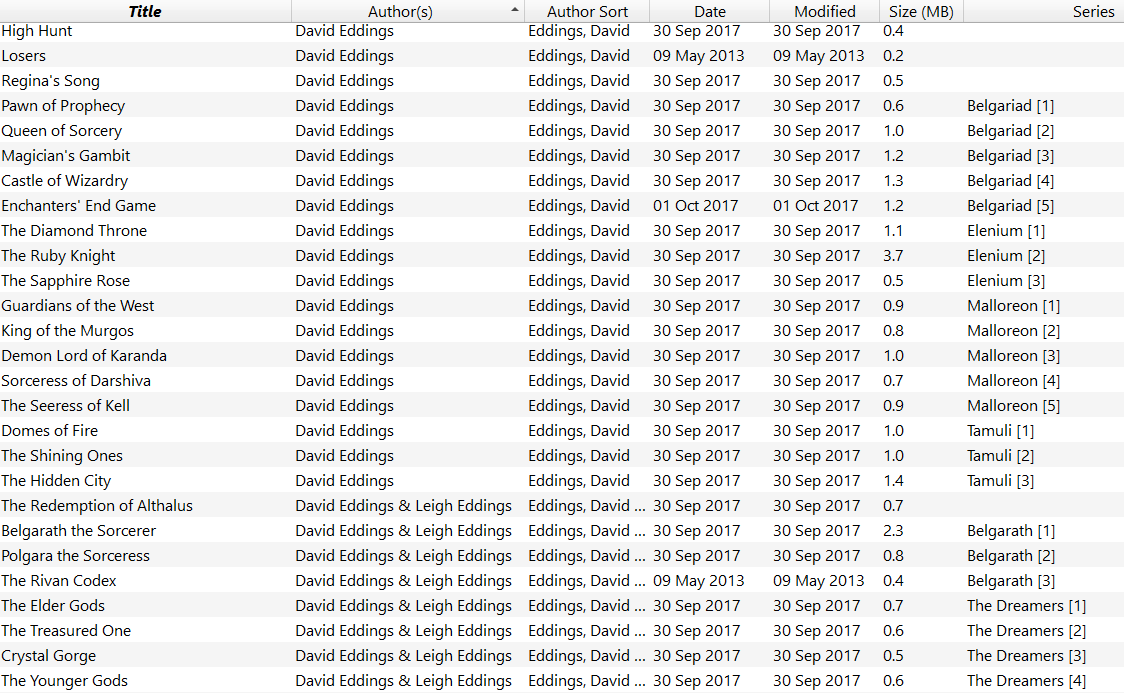 So the sort needs to be executed in the reverse order to bias the results of the next . Your sort also has conflicting requirements. You can't have Series and Title work together. eg Book2 TITLE is Zebra, 3 is Apple, 4 is 3 bodies The Title sort result should be: 3 bodies, Apple, Zebra, but the Series sort is the reverse you can't have both together If you want to see the Author in Title order, you sort by Title, then Author You can test your plan by clicking the column headers in the EXACT order you will put in the tweak (2 clicks reverses the column sort)Series can add even another layer when there are multiple Authors participating in the same series. {Authors} when sorted must all be the same ones (the order shown in the column seems to be ignored) |