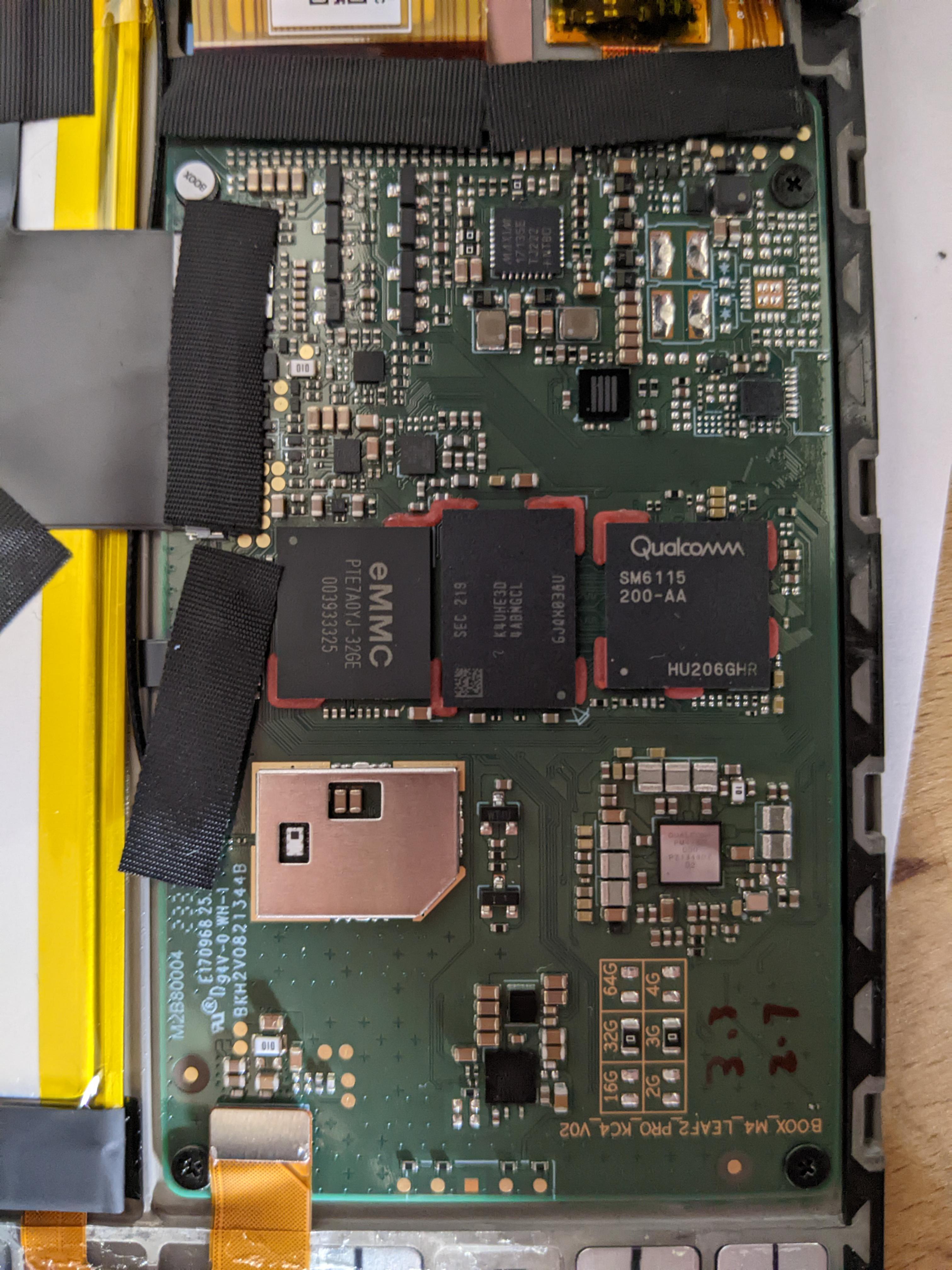 On the mother board, the battery connector is on the bottom left. And the USB-C connector. Suprisingly, the motherboard is labelled for the Boox Leaf 2 Pro. |