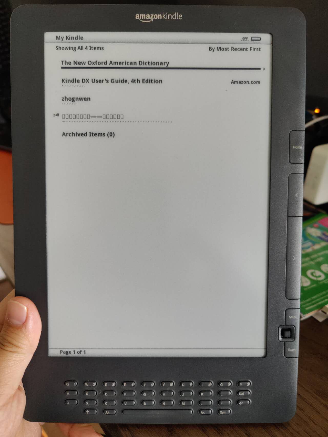 Firstly, huge respect to you seeing you are still replying people in this thread even in 2024, which is unbelievable for all the love and effort that you put for such many 10+ years! I bought my DXG from a neighbor yesterday (i have had a fantastic kindle 3 keyboard for years but there are couple of badly scanned PDF books i don't feel comfortable reading on the 6 inch screen. which made me wanna try the 9 inch DXG). Today I tired to jailbreak and put Chinese font into it, but failed. But i get no idea what step I missed or could there be any other software problems. can you help take a brief look at it ? basically what i did was : 1. checked version (pic1) 2. downloaded Update_jailbreak_0.13.N_dxg_install.bin. Put in kindle root dir, eject USB device. update kindle. kindle run into U006 error code which is good. (in pic2) 3. downloaded Update_fonts_5.16.N_dxg_install.bin. put in root dir, eject USB device. update kindle. install successfully. 4. downloaded Droid_Sans, put the 12 newer 2011 TTF files from this folder to kindle linkfonts/fonts folder (replaced the same named old 1980 TTF fils) pic3. 5. copy paste the autoreboot file, rename it as 'reboot'. eject USB device. kindle rebooted successfully. But the chinese book (title) still failed to be readable, just being some boxes. (pic4). i feel like maybe i should download more chinese TTFs, then i downloaded NotoSansCJKsc-Bold.ttf NotoSansCJKsc-BoldItalic.ttf NotoSansCJKsc-Italic.ttf NotoSansCJKsc-Regular.ttf and put them to fonts folder and rebooted kindle again but chinese characters remained unreadable. now i'm running out of ideas. (maybe i should rename those CJK TTFs to be Serif_Bold/BoldItalic/Italic/Regular and use them to replace the existed TTFs?) Can you let me know if you have any idea? Thanks in advance!