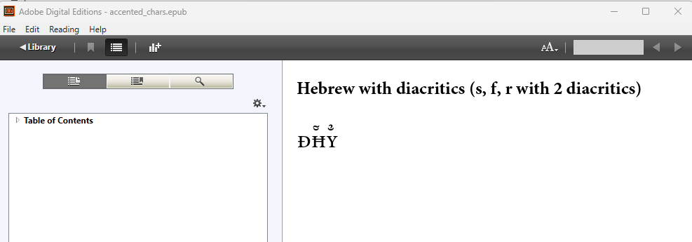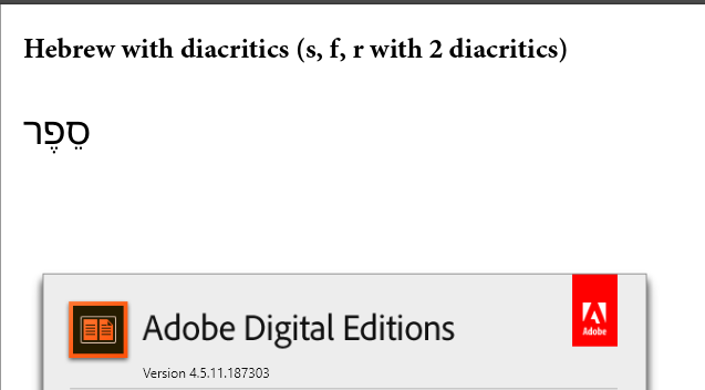 For what it may be worth, I opened the sample epub in ADE 4.5.11 and it did not show Hebrew characters while Thorium and Sigil did. I tried embedding the Stam Ashkenaz CLM font which did display the characters in ADE but ltr and without the accents so basically, for me, ADE 4.5.11 is a non-starter for right to left languages.