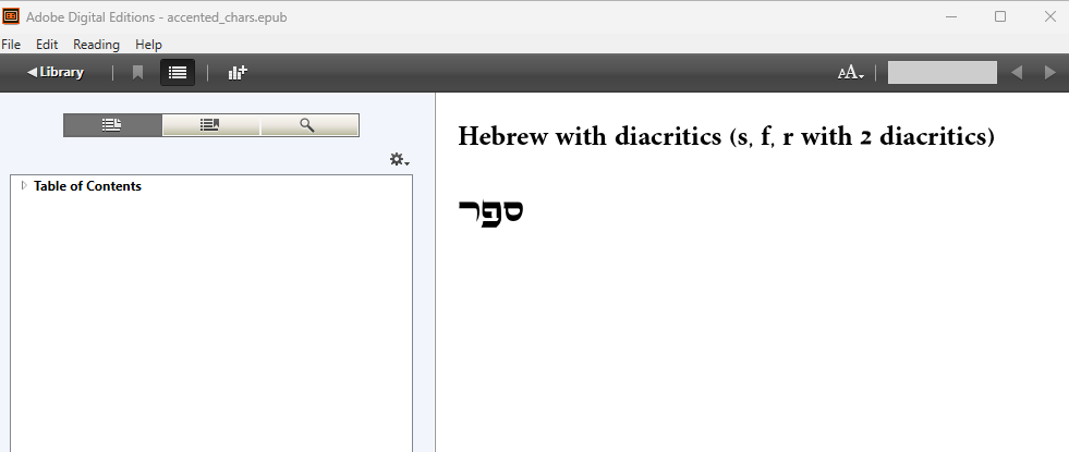 I tried editing a text with Hebrew characters, which appear normal in Sigil's preview window. However, in Adobe Digital Editions the encoding is all wrong, and the .epub file is unreadable. I have seen others talking about other problems with Hebrew texts, but no one said that the encoding is wrong and the file is unreadable. So, I conclude it's either Adobe Digital Editions, or it is a minor problem to fix which I don't know, being a beginner. I have included in this message a capture of the screen on Adobe Digital Editions. Can anyone please help? |