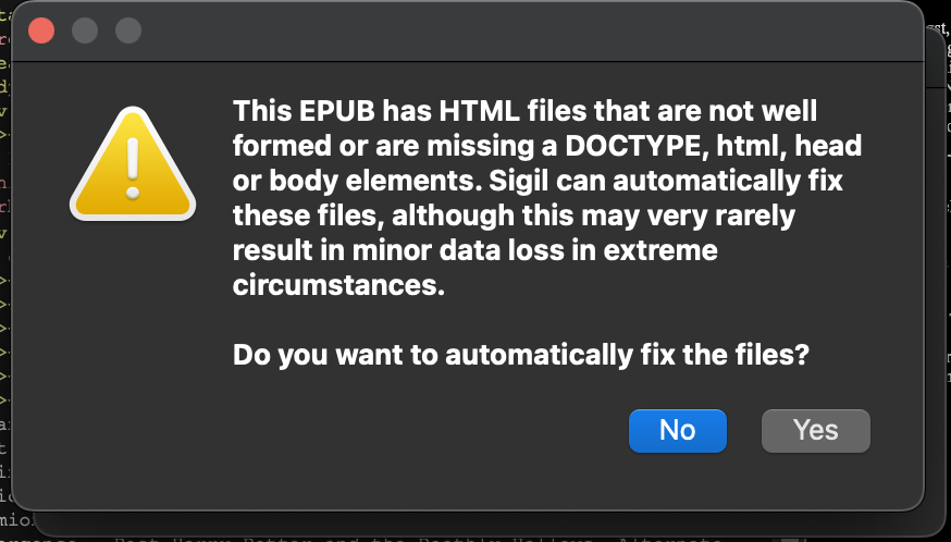 In the previous version of Sigil, the "automatic file fix" pop-up had "Yes" as the default highlighted selection. This current update defaults to highlight "No" instead. Is it possible to have that revert back so that "Yes" is the default?