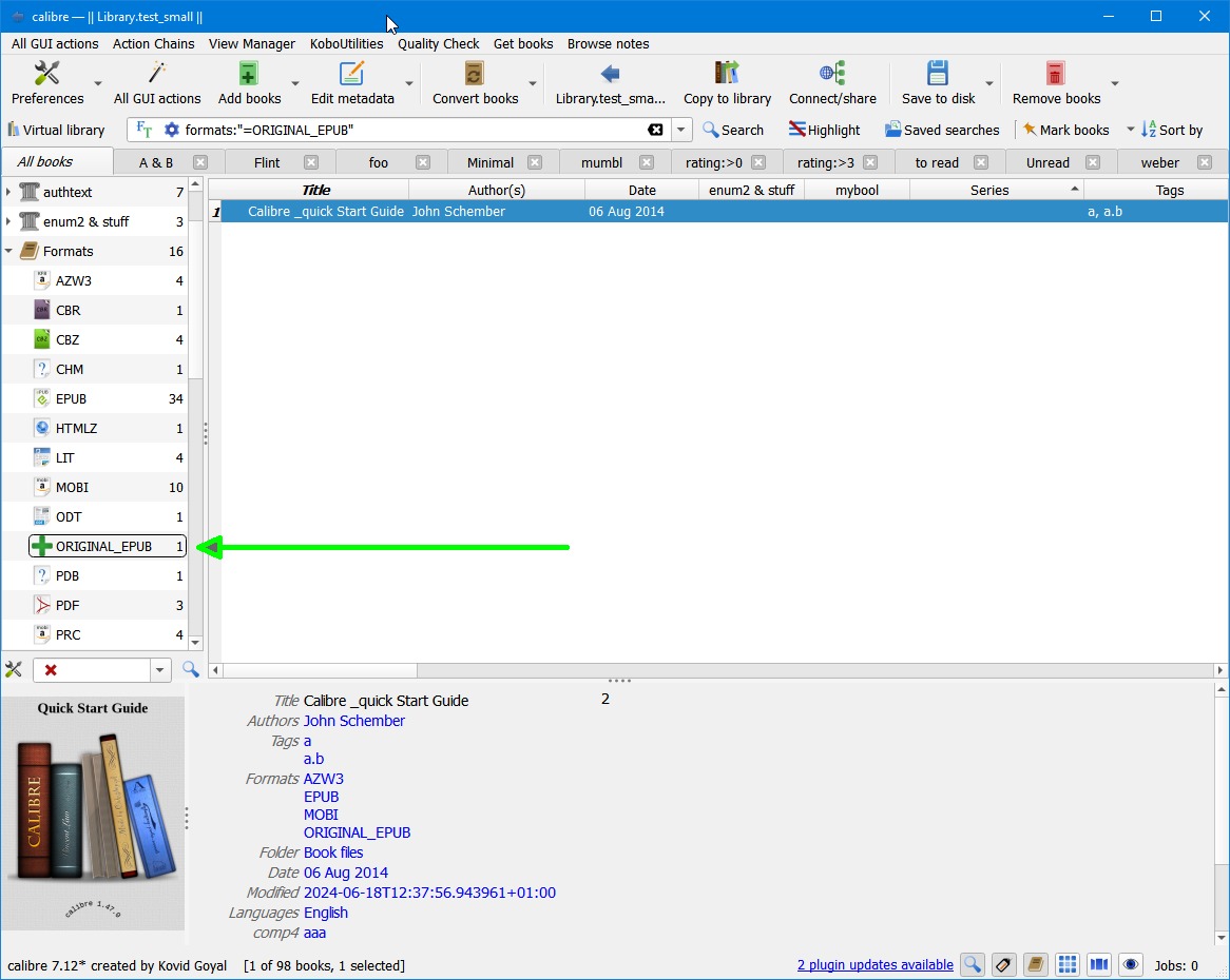 Note: while preparing this post I found a bug in the current calibre version where the tag browser formats list isn't cleaned up after deleting formats. I submitted a fix to Kovid for the next release. In the meantime you can "force" a cleanup by typing E (for edit metadata) then immediately pressing OK. EDIT: The fix is now in calibre source and will be in the next release/preview. Last edited by chaley; 06-18-2024 at 09:22 AM. |