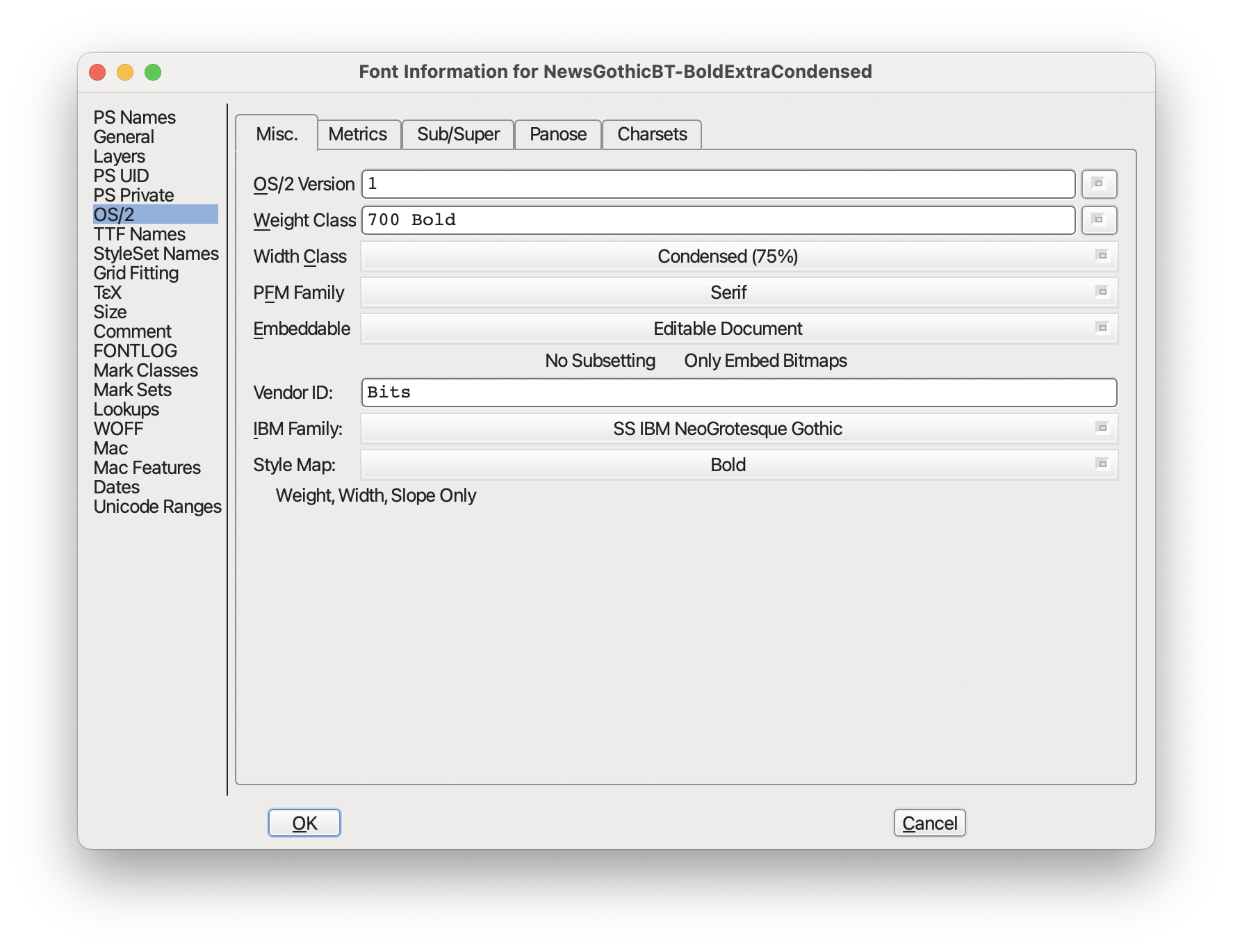 I've been using FontForge to check things with fonts in order to do things like get the font family name (because it was very wrong in the stylesheet originally for this font; it was listed as the font filename rather than the font family name). I've also been able to inspect other relevant properties with it, too (see the attachment for a screenshot). Quote: