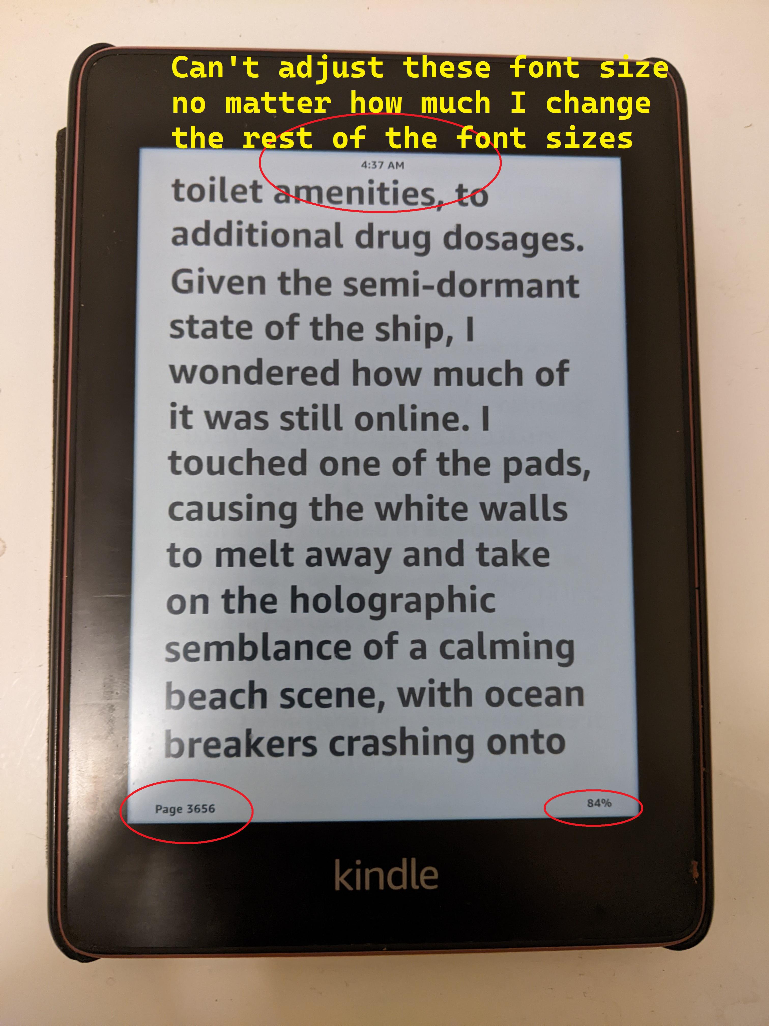 But there doesn't seem to be any way to change the time, page, progress fonts, which drives me nuts. 'how many percent left'? I am on firmware 5.13.4, jailbroken, mostly because it annoyed me it was in jail in the first place. I would be MOST happy if these fonts would scale with the rest of the fonts, but just permanently a little bigger or a couple sizes they could adjust to would be ok too. Thanks for any help! |